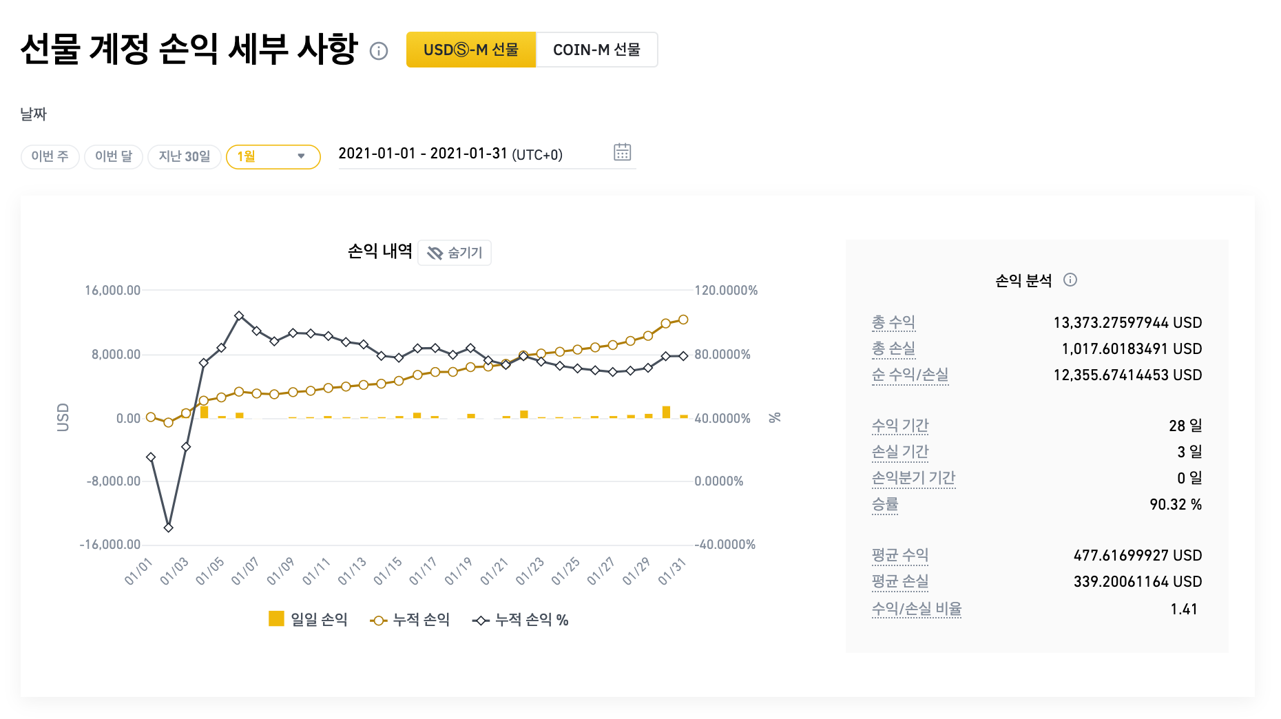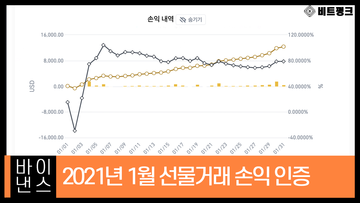 안녕하세요. 비트펑크입니다. 오늘은 바이낸스 선물 거래 손익 인증 일지를 작성해보려고 합니다. 저는 지난 4년 여간 암호화폐 선물 트레이딩을 진행해오고 있는데요. 2021년 1월 한 달 동안 승률 90%, 수익 1400만원 가량을 달성했습니다.