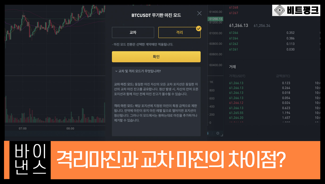 바이낸스 선물에서는 격리(isolated) 또는 교차(cross) 마진을 사용할 수 있는데요. 마진 할당과 레버리지 운용, 청산 과정 등에 큰 차이가 있습니다. 이번 설명 글을 통해 격리 마진과 교차 마진의 차이점에 대해 자세히 알아보시기 바랍니다.