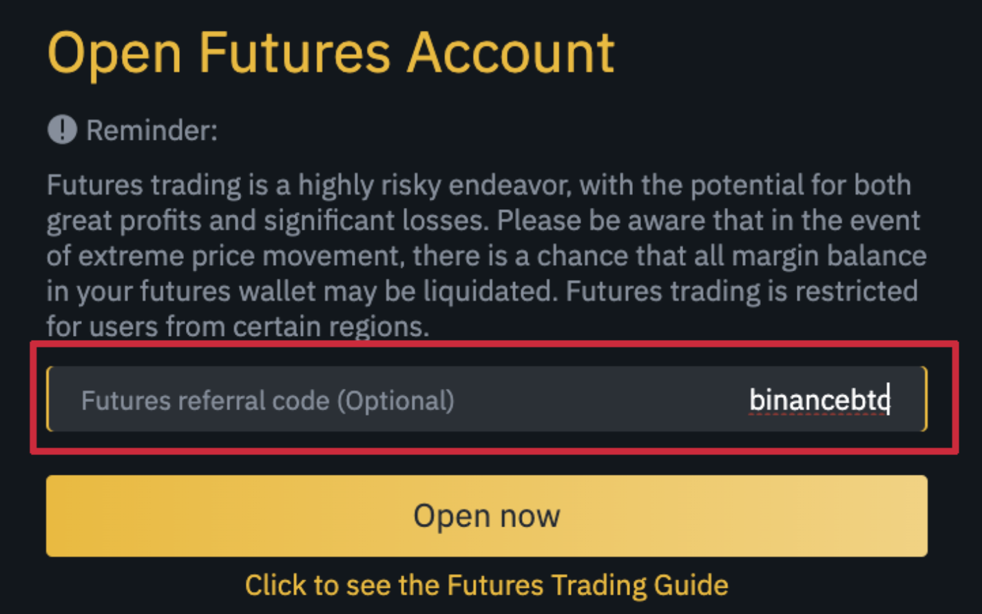바이낸스 선물 거래소의 수수료 할인은 현물과 달리 최대 10%입니다. 선물 거래 페이지에서 계정을 개설하시며 다음 레퍼럴 코드를 입력하시면 10%를 할인받으실 수 있습니다.