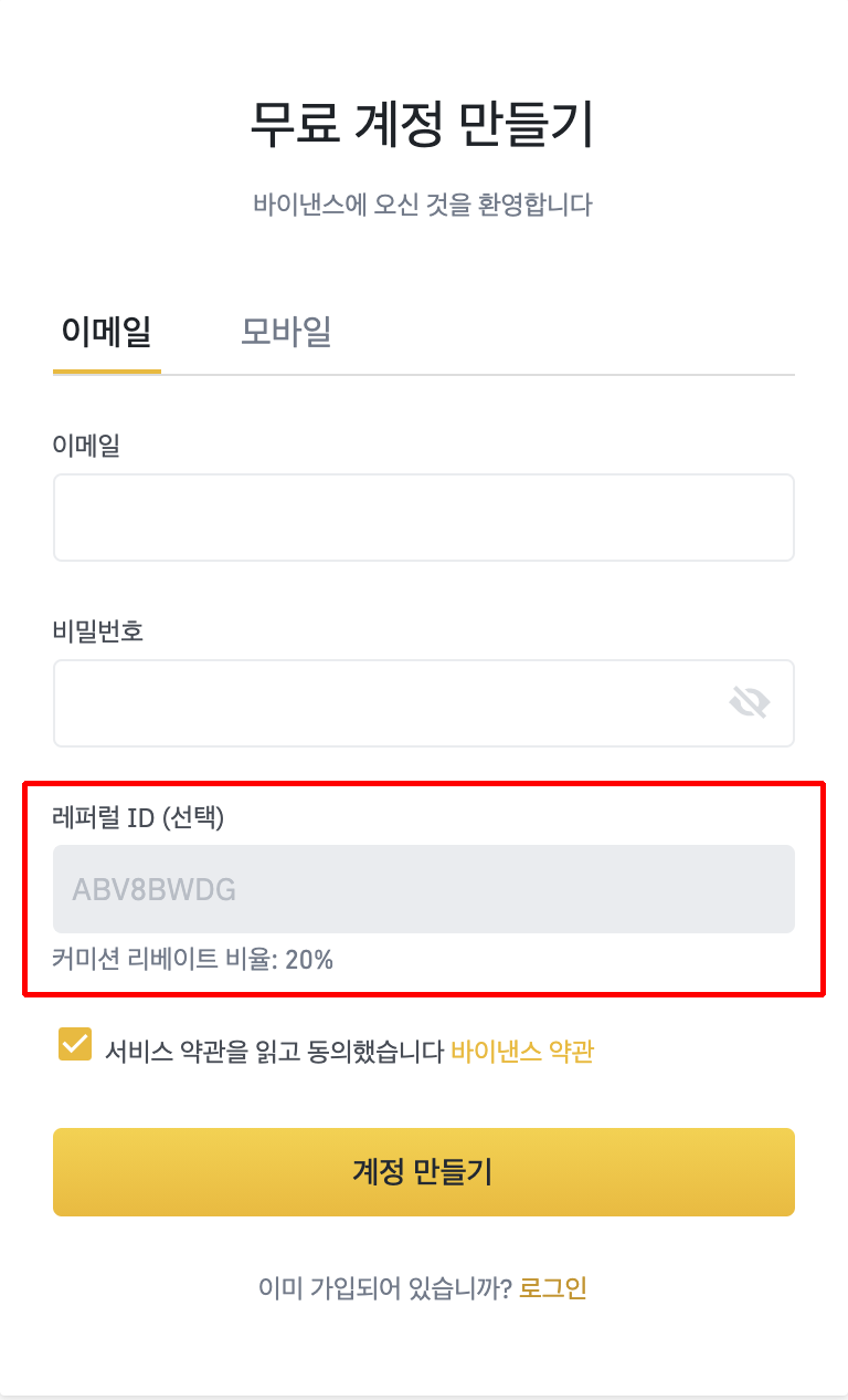 - 링크로 이동: https://www.binance.com/ko/register?ref=ABV8BWDG