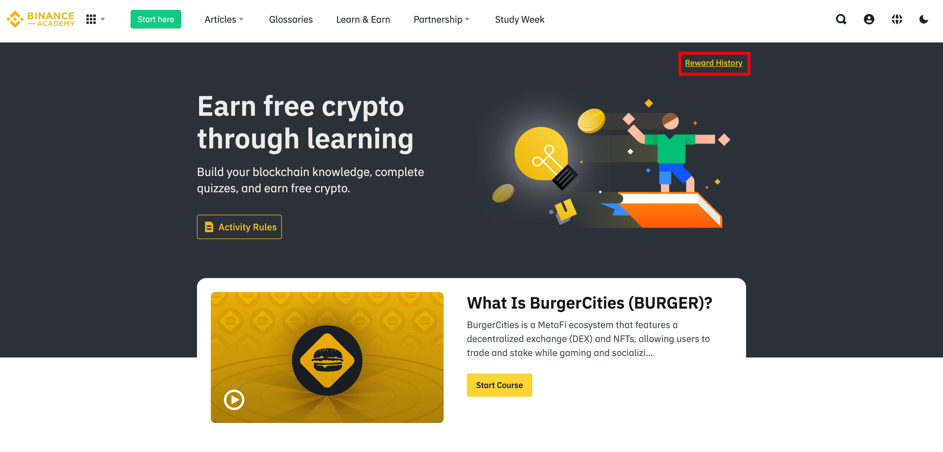 이미 신원 인증을 마친 계정이 있는 경우 로그인한 다음 바이낸스 아카데미의 이벤트 페이지로 이동하세요. 다음과 같이 참여할 수 있는 교육 코스와 보상이 표시됩니다.