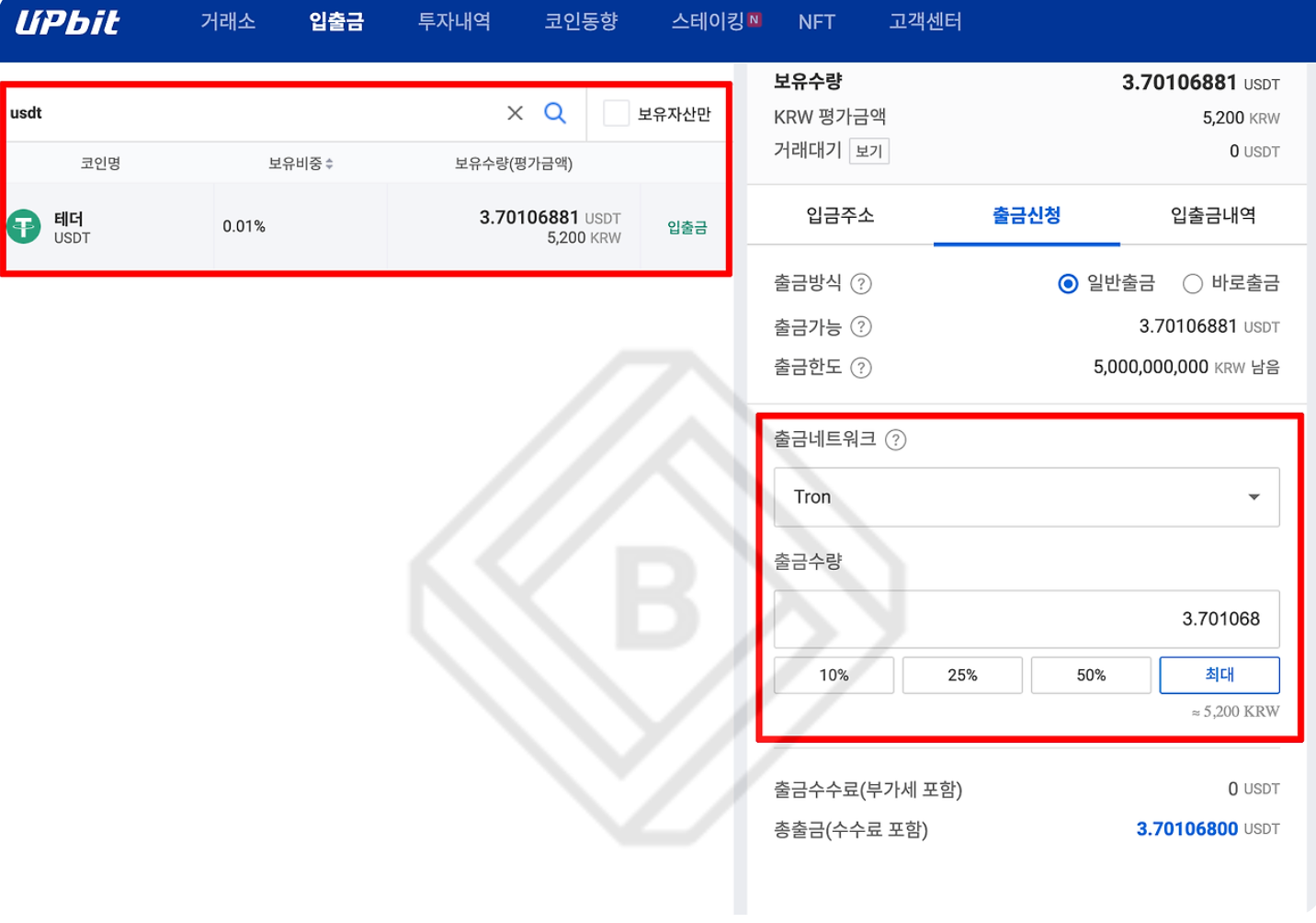 5. 업비트 출금 탭으로 이동하여, 출금 네트워크 Tron을 선택합니다. 다음으로, 바이낸스에서 복사한 입금 주소를 업비트에 붙여넣습니다.