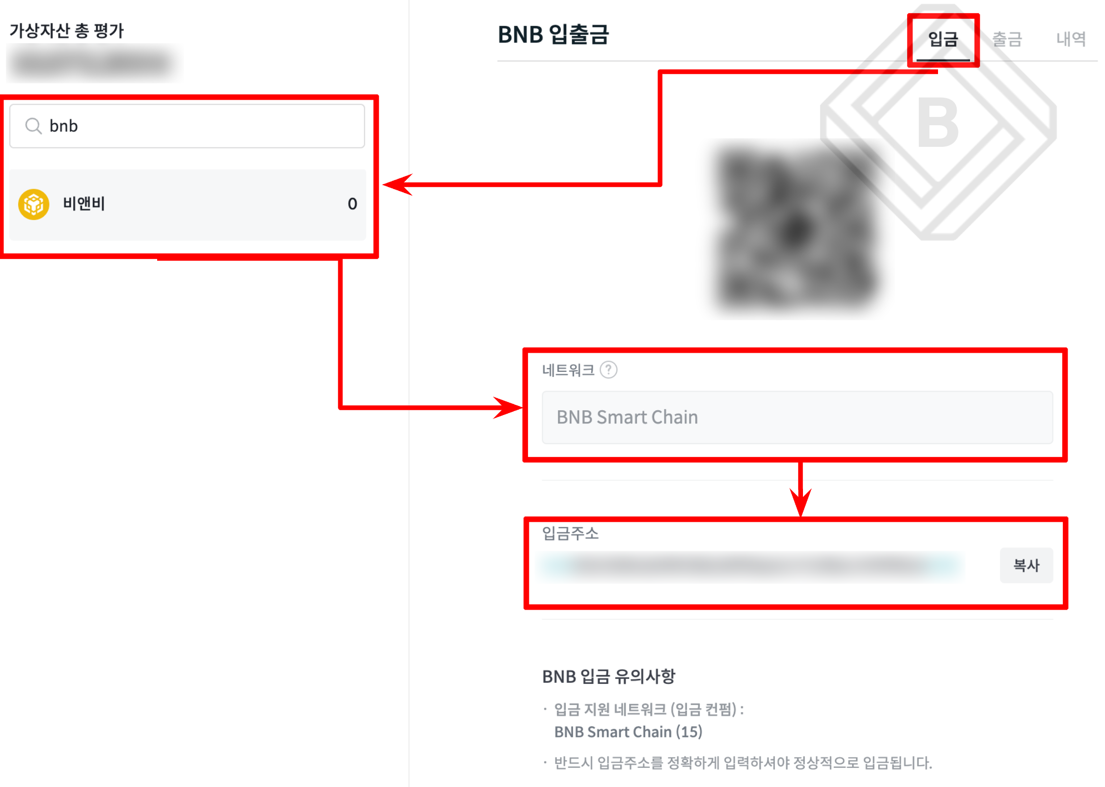 4. 입금을 진행할 국내 거래소(예: 빗썸)에 로그인한 다음, 입금 탭에서 BNB를 검색해줍니다. BNB 입금 주소와 함께, 지원하는 네트워크(BNB Smart Chain)가 안내됩니다.