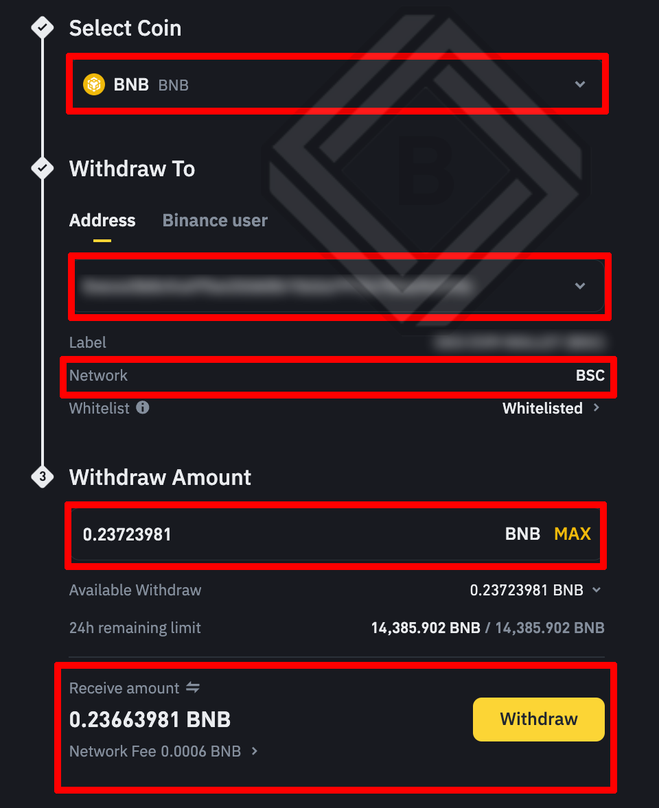 5. 바이낸스 거래소로 돌아가 [Address] 부분에 입금 주소를 입력하고, 네트워크는 BNB 스마트 체인 'BSC'를 선택해줍니다.