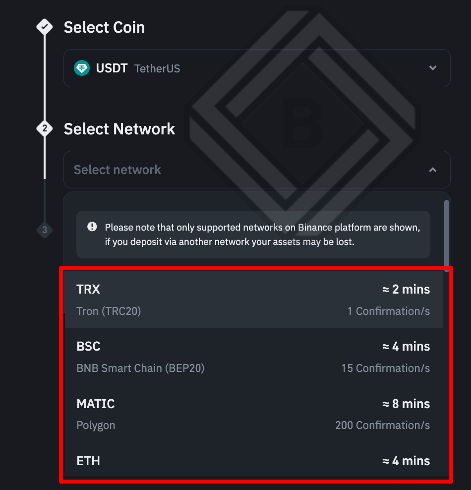 4. USDT 입금에 사용할 수 있는 네트워크가 표시됩니다. 업비트와 같은 국내 거래소에서 출금하는 경우 TRX20 트론 네트워크를 선택하시면 됩니다.