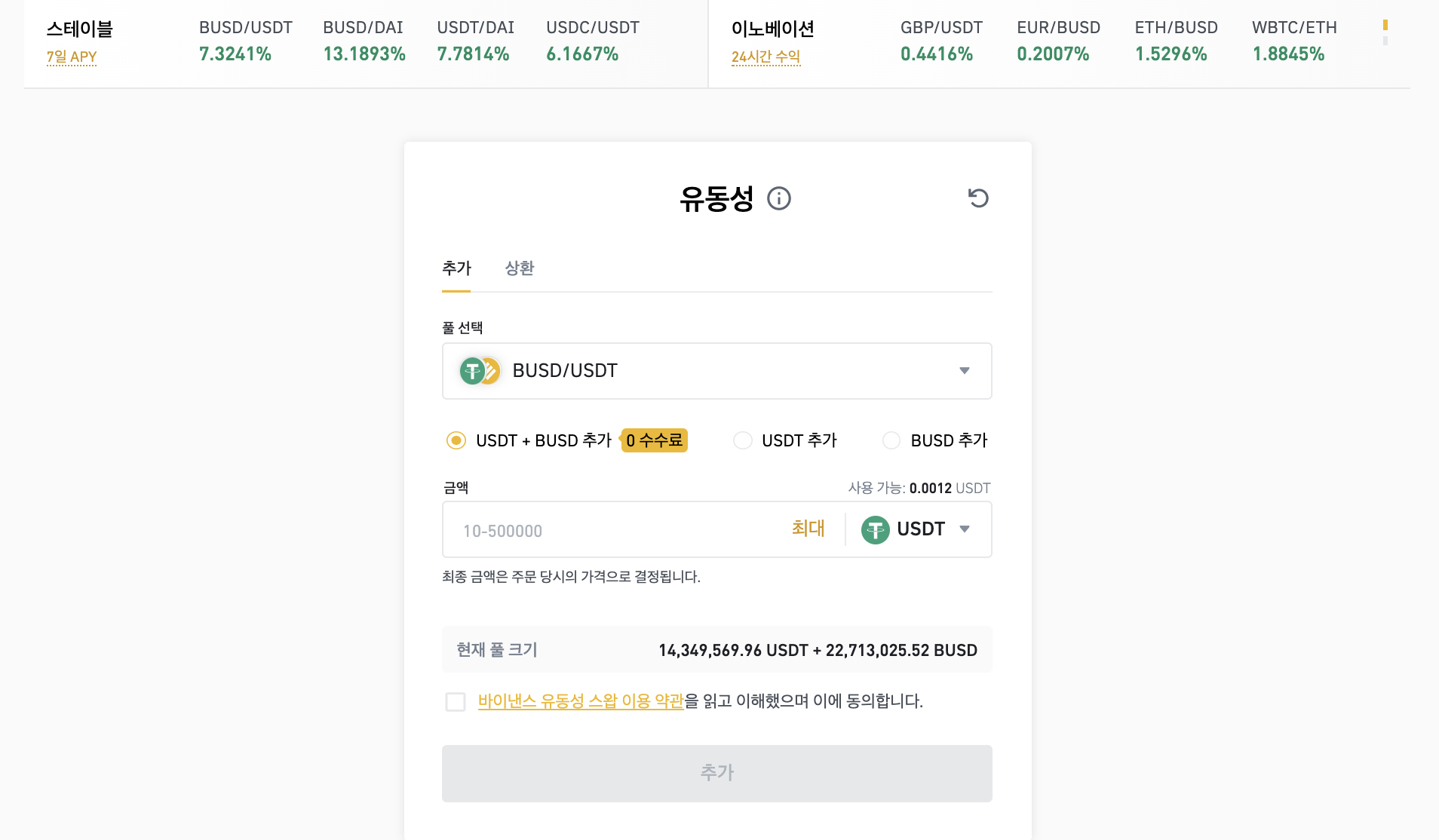 이렇게 유동성 풀에서 원하는 풀을 선택에 참여할 수 있습니다. 바이낸스 유동성 풀에는 크게 스테이블과 이노베이션 구역이 있는데, 스테이블 구역은 BUSD, USDT, DAI 등 거의 동일한 자산 가치를 갖는 스테이블코인으로 참여하는 곳이고, 이노베이션 구역은 AUD, GBP, ERU 뿐만 아니라 ETH, WBTC 등 변동성이 있는 자산을 예치하고 이자를 받을 수 있는 곳입니다.