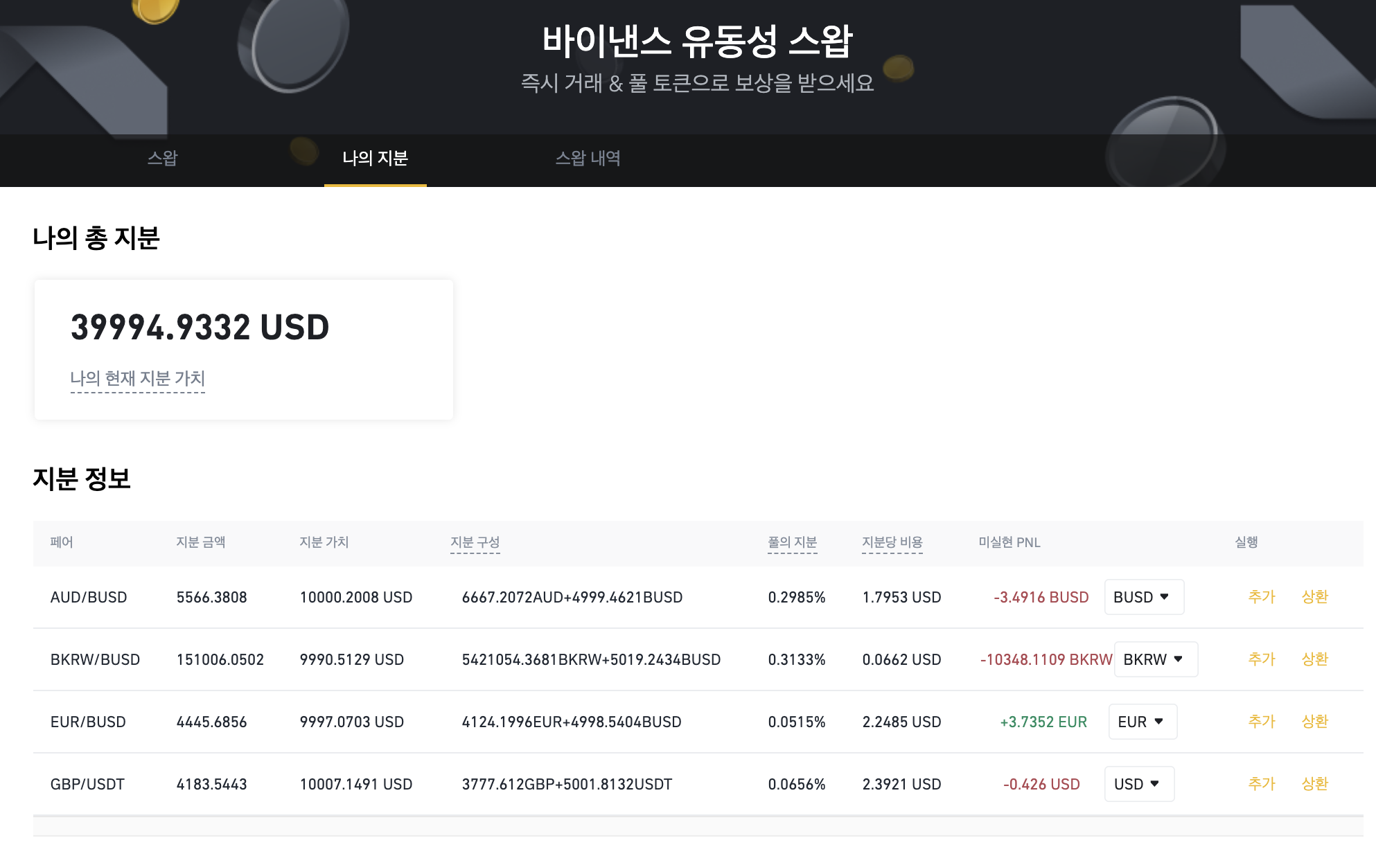 현재 제가 참여한 풀 구성입니다. 각 통화별로 1만 달러에 해당하는 금액을 예치했습니다. 현재 손익이 마이너스인 이유는 통화쌍을 추가할 때, BUSD와 USDT로 단일 추가했기 때문에 거래 수수료가 발생했기 때문입니다. 이론상으로는 하루가 지나면 모두 회복되는 금액이죠.