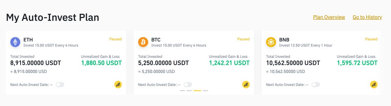 바이낸스에 가입하고 수익 창출 [Earn] - 자동 투자 [Auto-Investment]로 이동하시면 원하는 때에 원하는만큼 코인을 분할로 계속해서 매수하는 자동 투자 플랜을 활성화하실 수 있습니다.