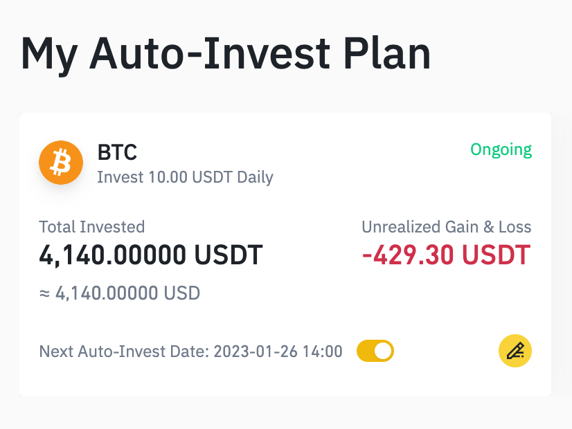 마지막으로 자동 투자 하실 때는 달러로 진행을 합니다. 따라서 환율과 김프를 고려하셔야 합니다. 정리하자면 바이낸스 자동 투자로 1~2달 사이의 짧은 분할 매수도 가능하지만, 보다 넓은 타임 프레임에서 진행할 때 효과가 좋은 투자 방식이라고 할 수 있습니다.