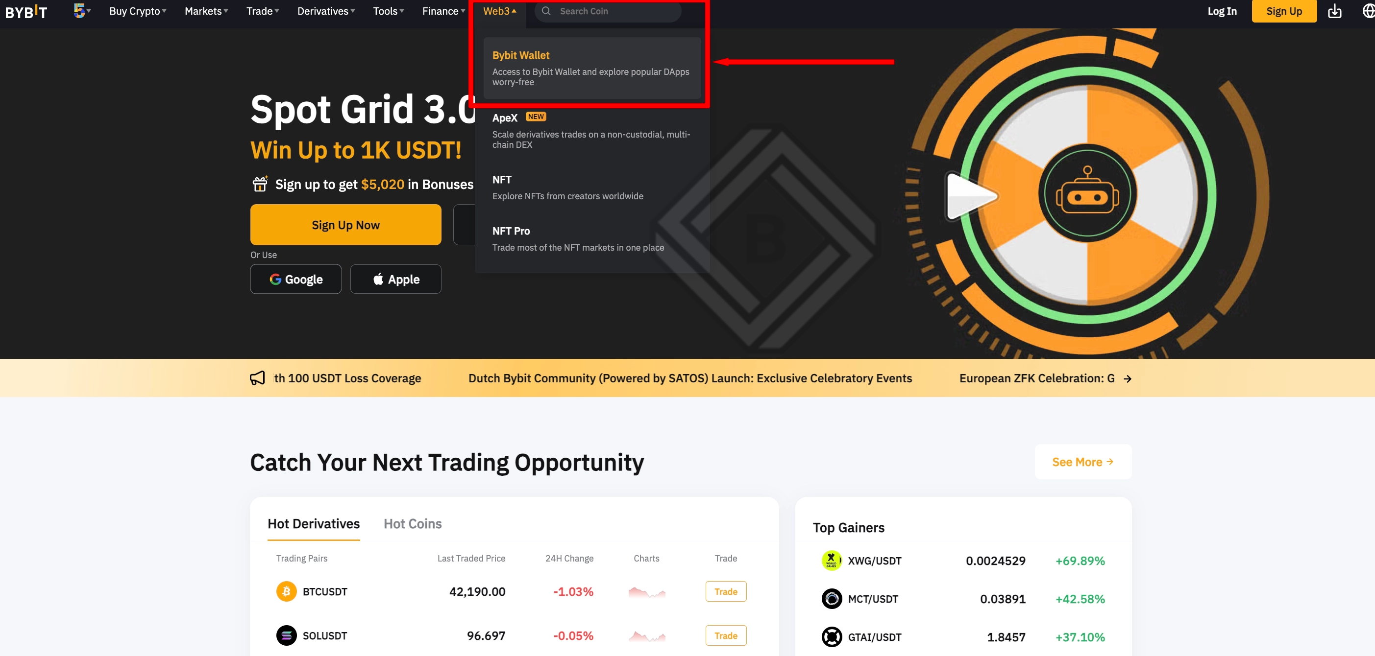 1단계: 바이비트 로그인 후 내비게이션 바에서 [Web3]를 클릭해 바이비트 웹3 페이지로 이동하세요.