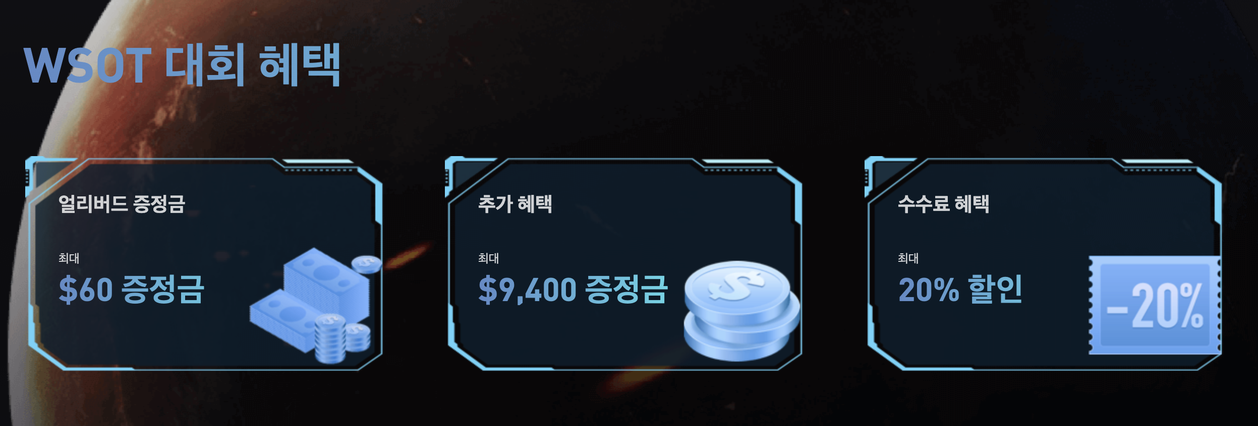 현재 사전 등록시 $60 달러 증정금을 지급합니다. 저도 이미 신청을 해둔 상태고요. 최대 $9,400 달러 증정금을 추가 혜택으로 지급합니다. 해당 증정금은 현재 수령이 불가능한데, 거래 개최후 입금 금액에 따라 지급해 주지 않을까 추정하고 있습니다.