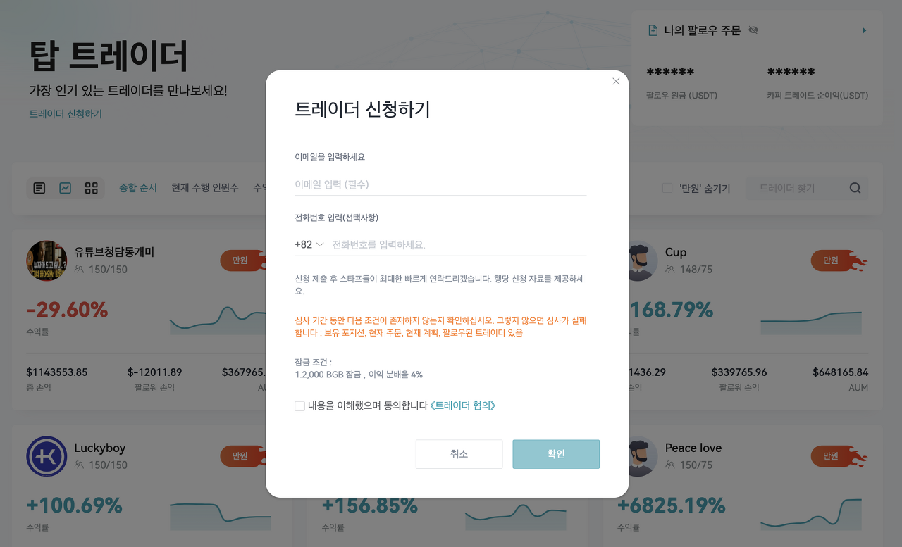 - 카피 트레이더는 하나의 계정으로만 등록할 수 있습니다.
