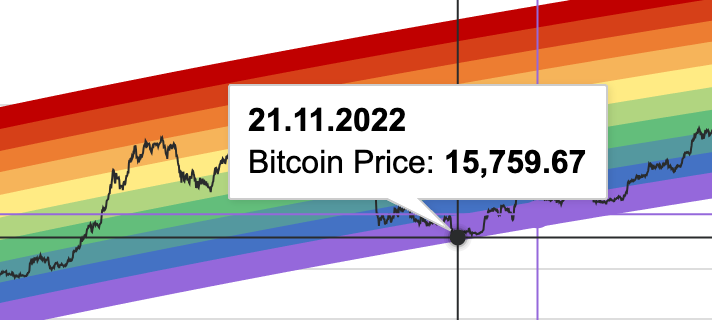 레인보우 차트를 보면 가장 먼저 알 수 있는 것이 바로 현재 비트코인이 지금 어느 구간에 있느냐 하는 것입니다. 만약 가격이 하단 밴드에 있다면 '비트코인이 저평가된 상태군?'이라고 생각할 수 있습니다. 반대로 빨간색 밴드에 가까우면 "어, 이건 좀 과열된 상태 같은데? 팔아야 하나?"라고 생각할 수 있습니다.