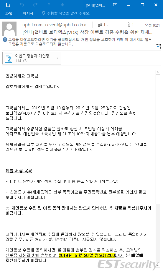 해당 파일은 단지 개인 정보만을 캐내는 게 아니라 또 어떤 악성 코드들이 심어져 있는지 알 수 없는 노릇입니다. 피싱을 막기 위한 첫번째 단계는 일단 첨부 파일은 다운 받지 않는 겁니다. 조금만 생각해보면 저렇게 첨부 파일로 제공하는 경우 거래소에서는 일일이 취합을 해야 하는데, 업비트처럼 규모 있는 거래소가 저런 일차원적인 방법을 쓸리는 없습니다. 예상치 않은 이벤트에 당첨됐다는 이메일을 받게 되실 경우 먼저 고객센터에 문의해서 확인하는 것이 좋습니다.