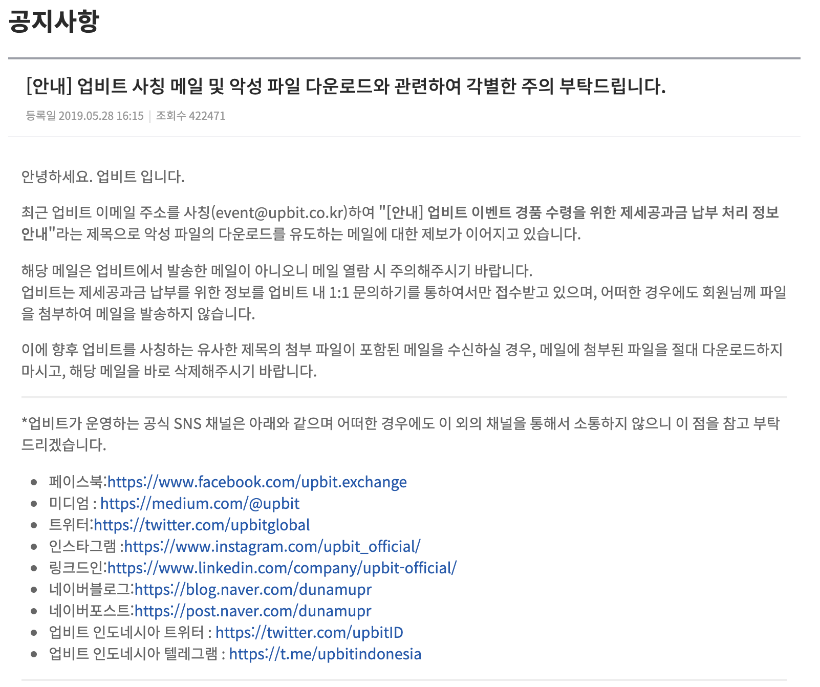제가 생각하는 암호 화폐의 가장 큰 문제 중 하나입니다. 피싱 사기에 걸려 개인 정보가 유출되거나 아이디와 비밀번호가 고스란히 노출되면 자신의 소중한 암호화폐가 영영 사라지게 되는 겁니다. 피싱 사기 이야기를 하는 이유는 최근 업비트에서 거래소를 사칭한 이메일이 발송되고 있다며 주의를 당부하는 공지를 띄웠기 때문입니다.