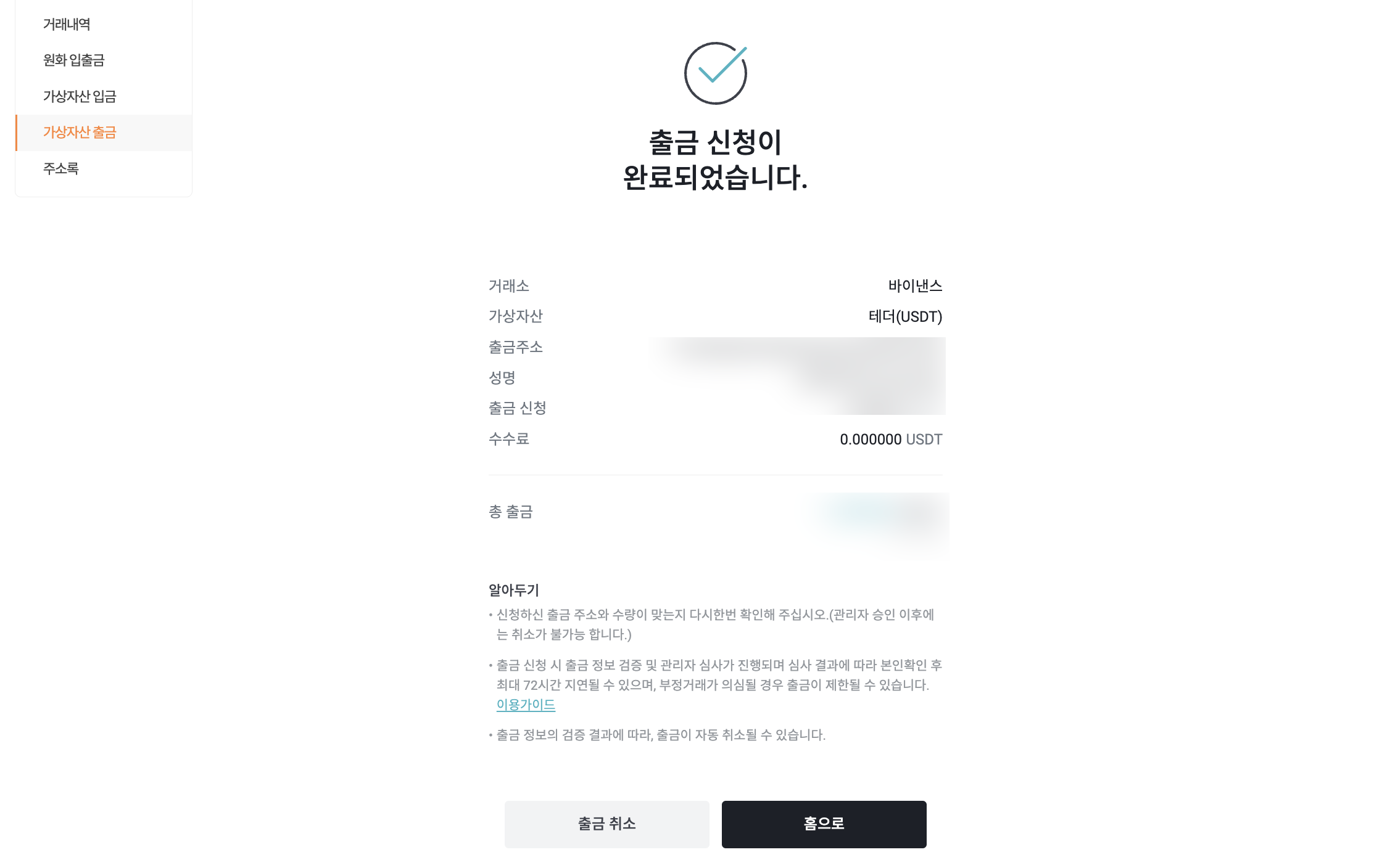 5. 출금 신청 완료 및 입금 확인