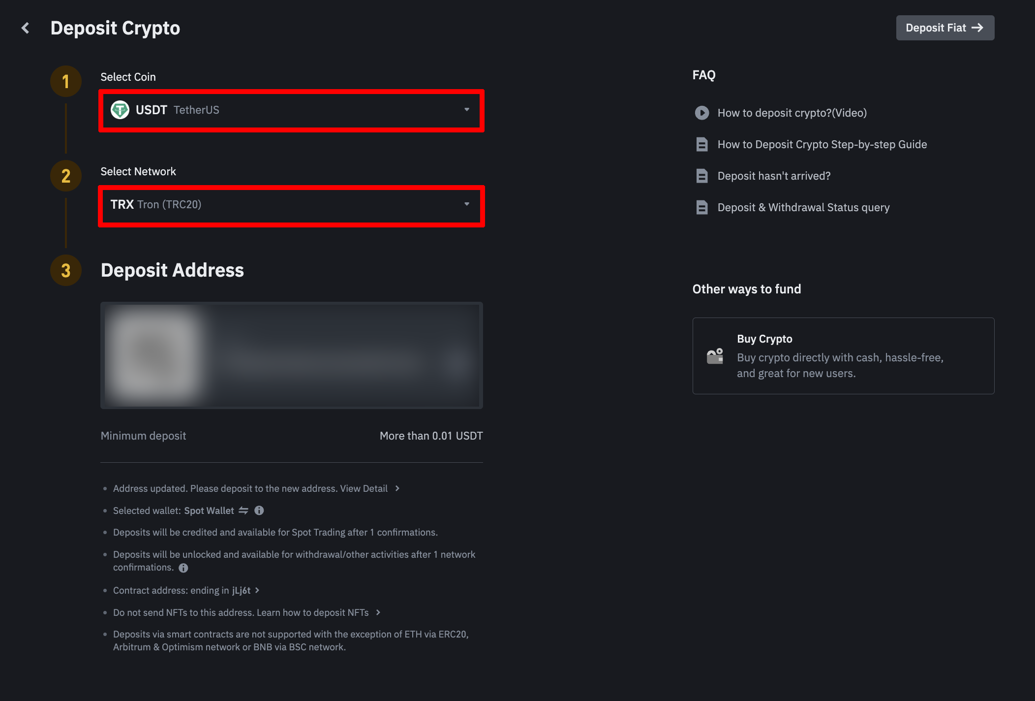 바이낸스 거래소의 경우 로그인 후 [Deposit] 탭에서 USDT 입금 주소를 확인하실 수 있습니다. 이 때, 아래와 같이 네트워크 유형이 트론(TRC-20) 네트워크인지 확인해주세요.