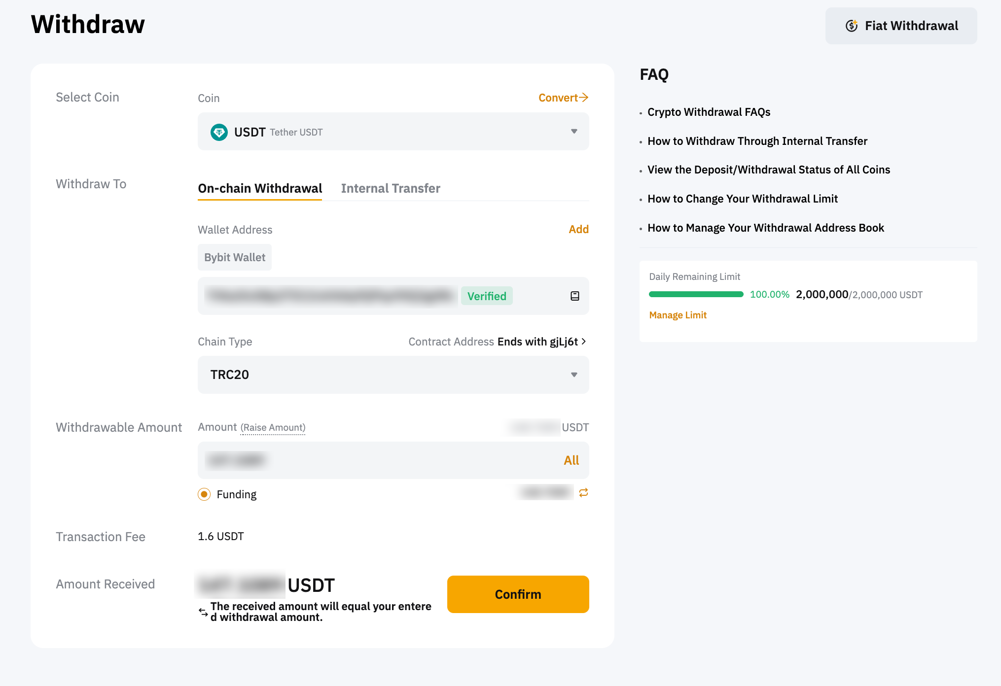 다음으로 체인 타입 [Chain Type]은 반드시 TRC20을 선택해주세요. 출금 금액 [Withdrawable Amount] 입력 후, 확인 [Confirm] 버튼을 눌러주세요.