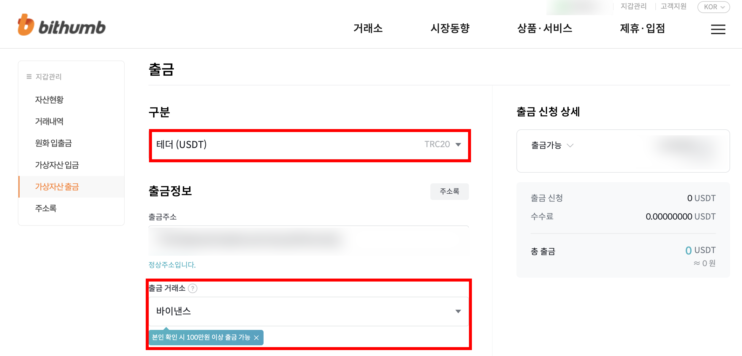 [지갑 관리] - [가상자산 출금] 탭으로 이동해주세요. 다음으로 해외 거래소의 USDT 입금 주소를 빗썸의 출금 주소에 입력해주세요.