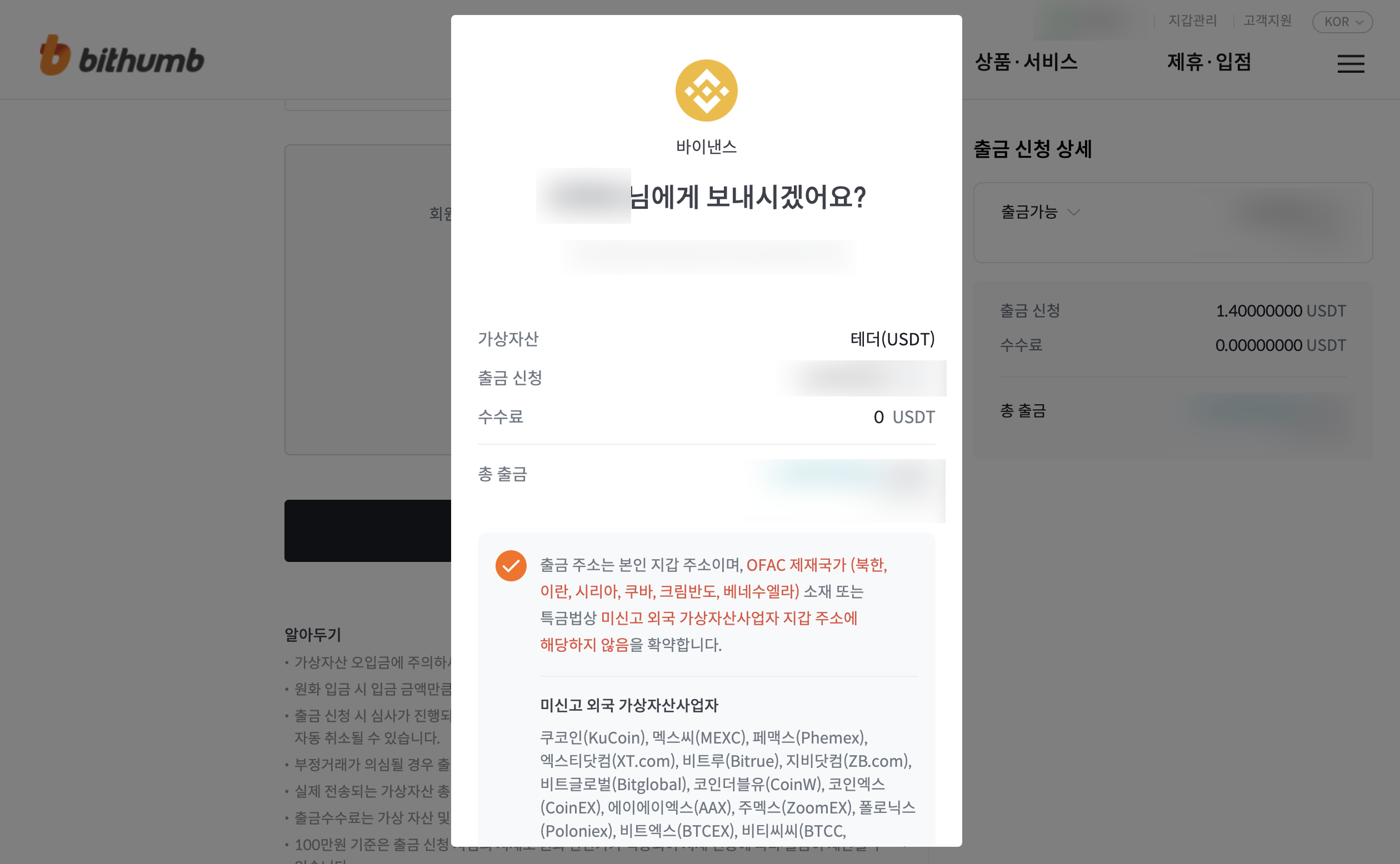 USDT 테더 출금 방법 (빗썸 > 해외 거래소)