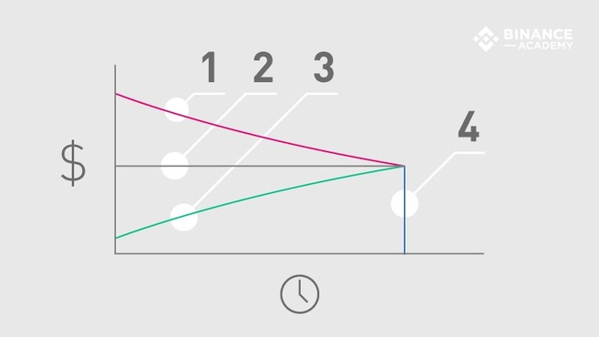 선물계약의 만기와 가격 변동 사이의 관계는 다양한 가격 패턴을 생성하는데요. 이를 일반적으로 콘탱고(1)와 노멀 백워데이션(3)이라고 합니다. 이러한 가격 패턴은 아래 그림과 같이 만기일(4)에 자산의 예상 현물 가격(2)과 직접적으로 연관됩니다.