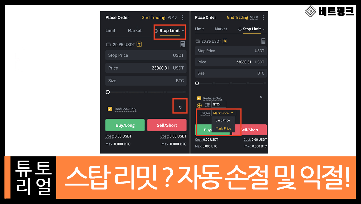 - 리밋 가격: 스탑 가격이 발동시키는 매수 또는 매도 가격. 즉, 주문이 체결되는 가격.