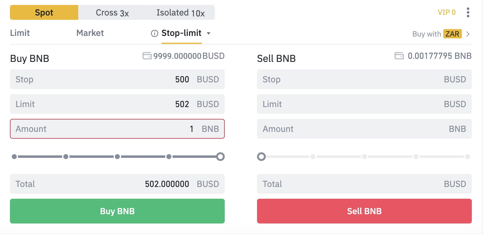 - 스탑 가격에 500 BUSD를 입력하고, 리밋 가격에 502 BUSD를 입력하고, 매수를 클릭합니다.
