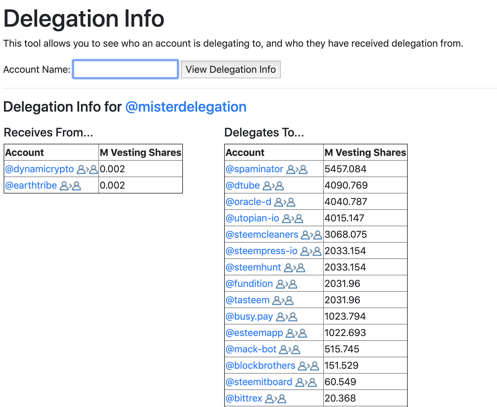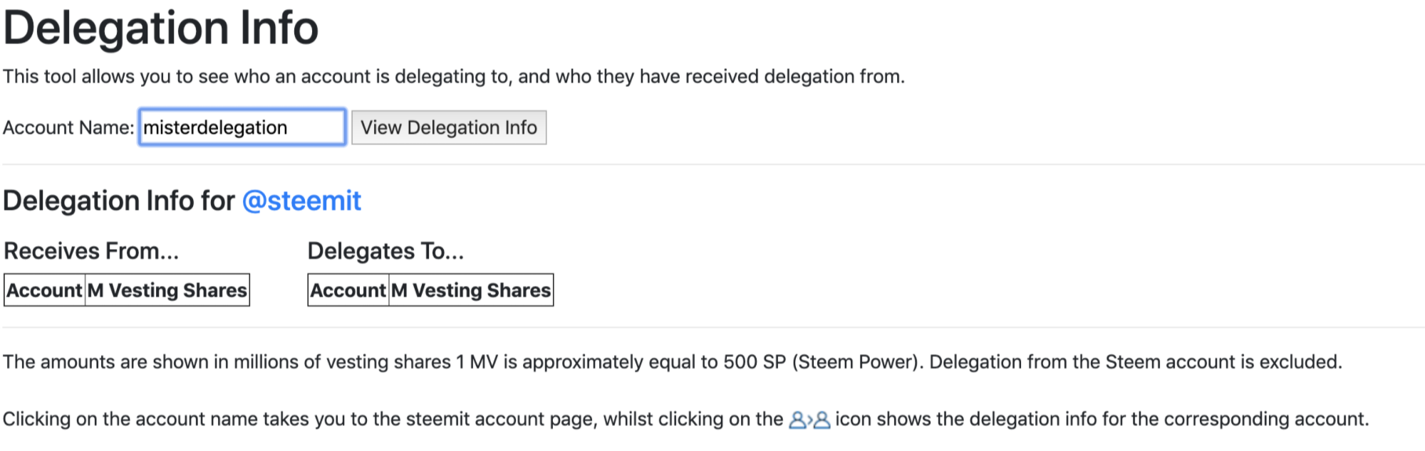 스팀잇 재단에서 운영하는 것으로 추정되는 @misterdelegation의 계정을 확인해 봤다. 아래에서 볼 수 있듯이, 계정의 위임 상태(위윔받은 양, 위임하고 있는 양)를 M Vesting Shares 값으로 확인할 수 있다. 참고로 1 MV(millions of vesting shares)는 대략 500 SP(Steem Power)에 해당한다.