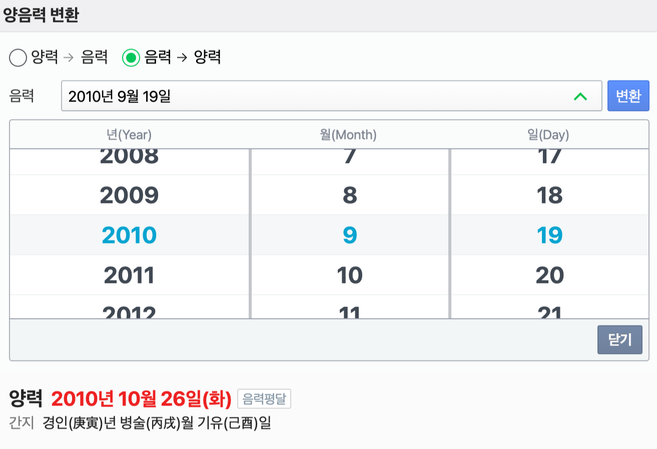 예를 들어, 음력 2010년 9월 19일을 변환하면, 양력 2010년 10월 26일로 나옵니다. 이런 식으로 원하는 음력 날짜를 양력 날짜로 변환해서 확인해주세요.