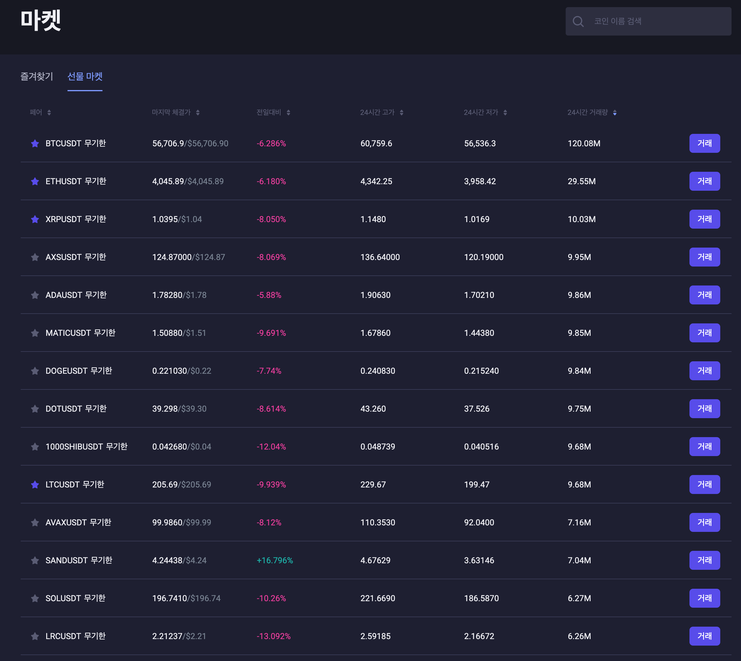 아폴로엑스 거래소는 바이낸스 클라우드 서비스를 사용하는 거래소입니다. 전 바이낸스 출신 직원들이 합류해있다는 소문이 있는데요. 아래와 같이 다양한 선물 계약들을 한국어 서비스와 함께 지원하고 있습니다.