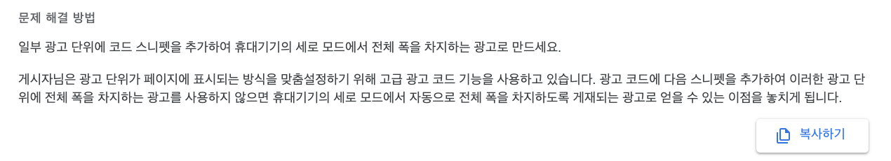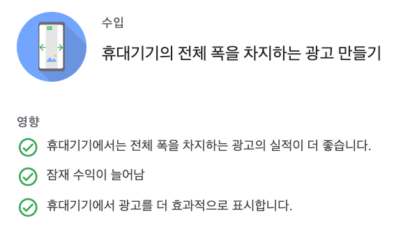 수동 광고다 보니 모바일에서는 상대적으로 많이 작아보이기 마련이었고(비율에 따라 줄어들다보니), 그래서 구글에서는 휴대폰이나 태블릿과 같은 모바일 기기에서 전체 폭을 차지하는 광고로 이를 수정하라는 추천을 해주었습니다. 실적이 더 늘어난다고 말이죠.