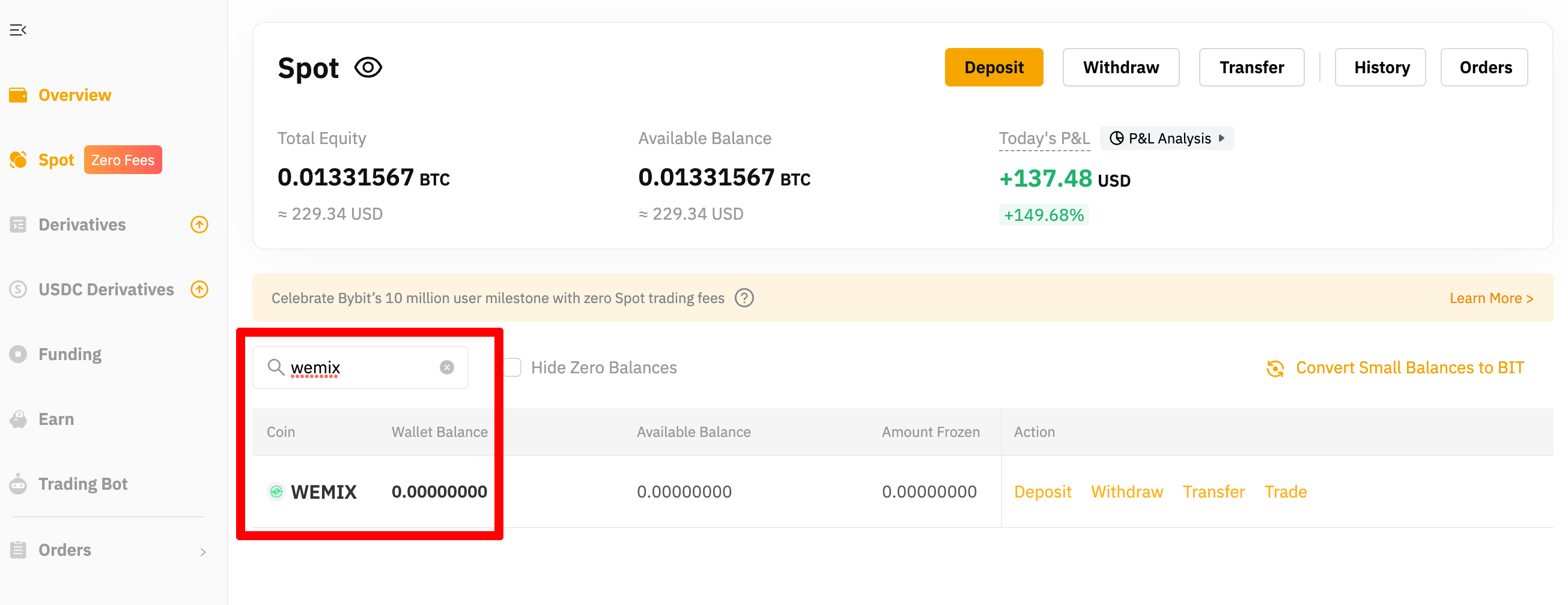 바이비트에서 위믹스를 판매하시려면 우측 상단의 거래 [Trade] - 현물 [Spot]을 클릭하여 이동하세요.