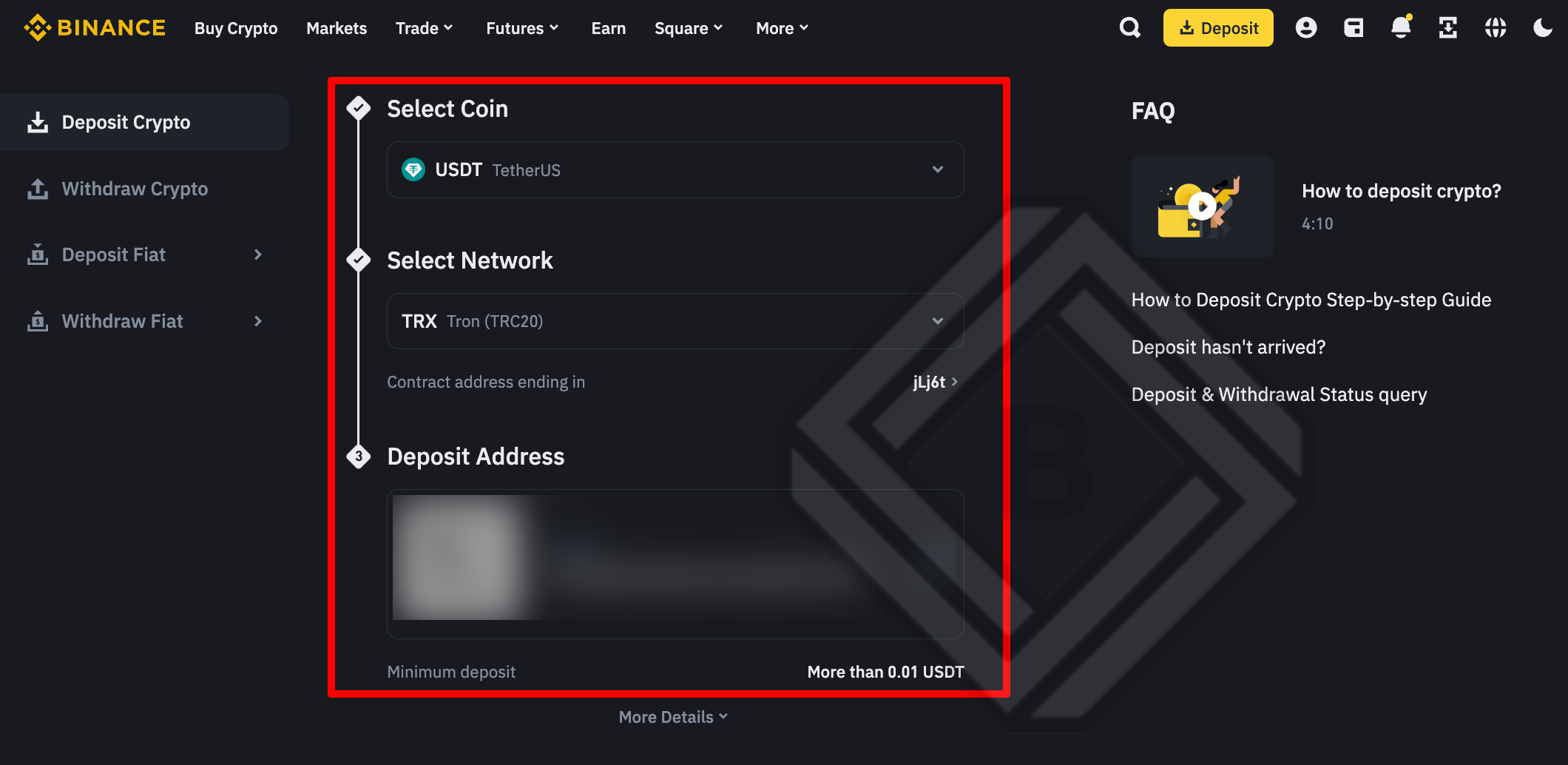 - 입금 네트워크로 트론(Tron, TRC20)을 선택하면, 입금 주소 [Deposit Address]가 표시됩니다.