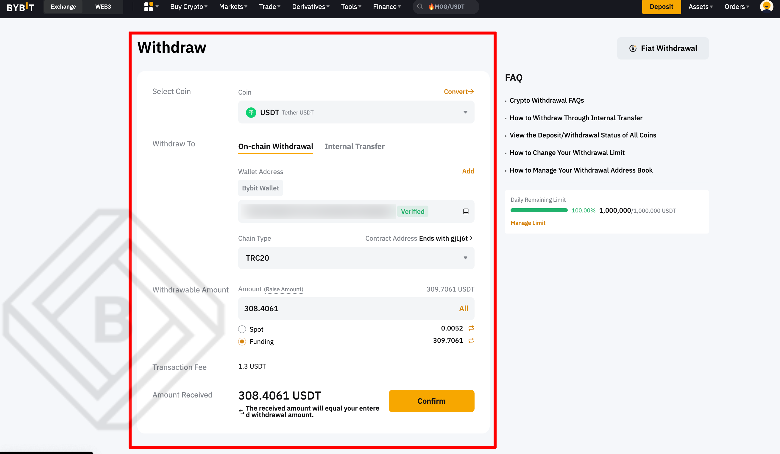- 출금 수수료 1.3 USDT 확인 후 [Confirm]을 눌러 절차를 완료하세요.