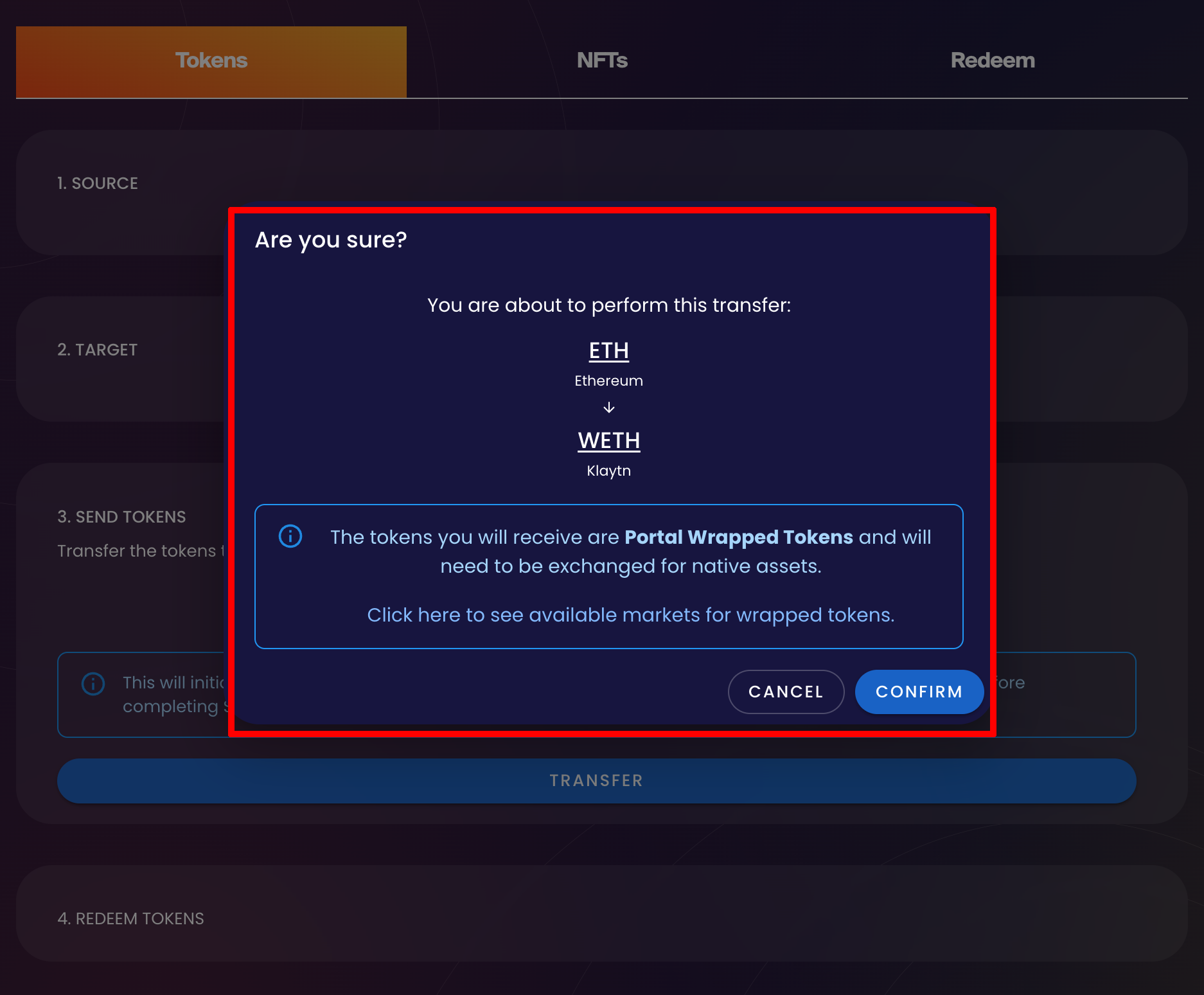 자산을 보내기 전에 트랜잭션을 한 번 더 확인합니다. 타겟 네트워크와 수령할 주소가 맞는지, 트랜잭션 수수료와 컨트랙트가 정확한지 꼭 확인해보세요. 여기서는 WETH로 래핑되어 전송된다고, 확인하라고 나오네요. 정확하다면 'CONFIRM'을 눌러줍니다.