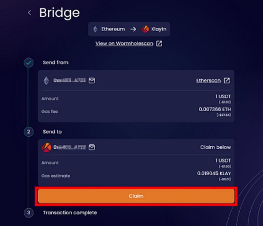 만약 중간에 페이지를 닫았다거나 지갑 연결이 끊겼다면, 웜홀 익스플로러에서 트랜잭션을 다시 조회할 수 있습니다. 조회한 트랜잭션을 브리지 사이트에 입력하면 자산을 수령할 수 있으니 크게 걱정은 안 하셔도 됩니다.