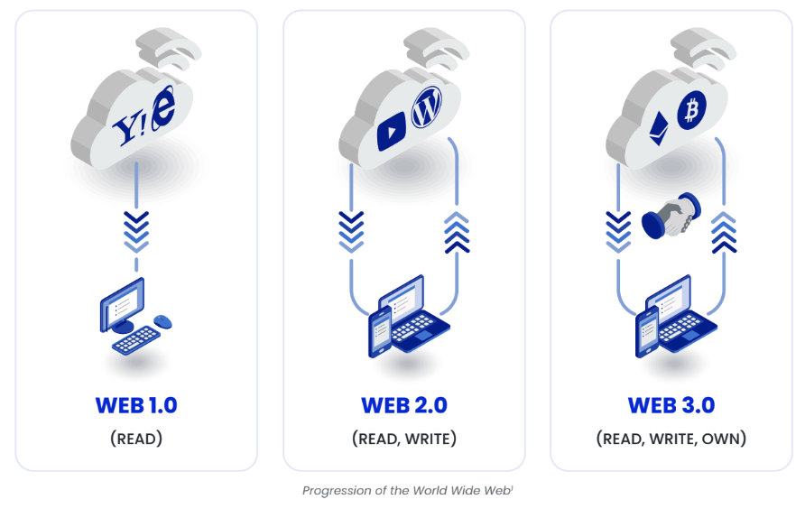 웹은 1991년에 처음 출시되었습니다. 첫 출시된 웹을 1.0이라 하며 이는 유저가 수동적으로 정보를 수신하는 단순한 포털에 불과했습니다. 이후 유저가 참여하여 다른 유저와 상호작용하는 웹 2.0이 출시됐습니다. 오늘날 우리가 사용하는 유튜브, 페이스북, 위키백과 등이 바로 2.0에 해당합니다. 웹 3.0은 블록체인, 인공지능, 토크노믹스 등을 적용하여 웹상의 데이터 소유권을 구현합니다.