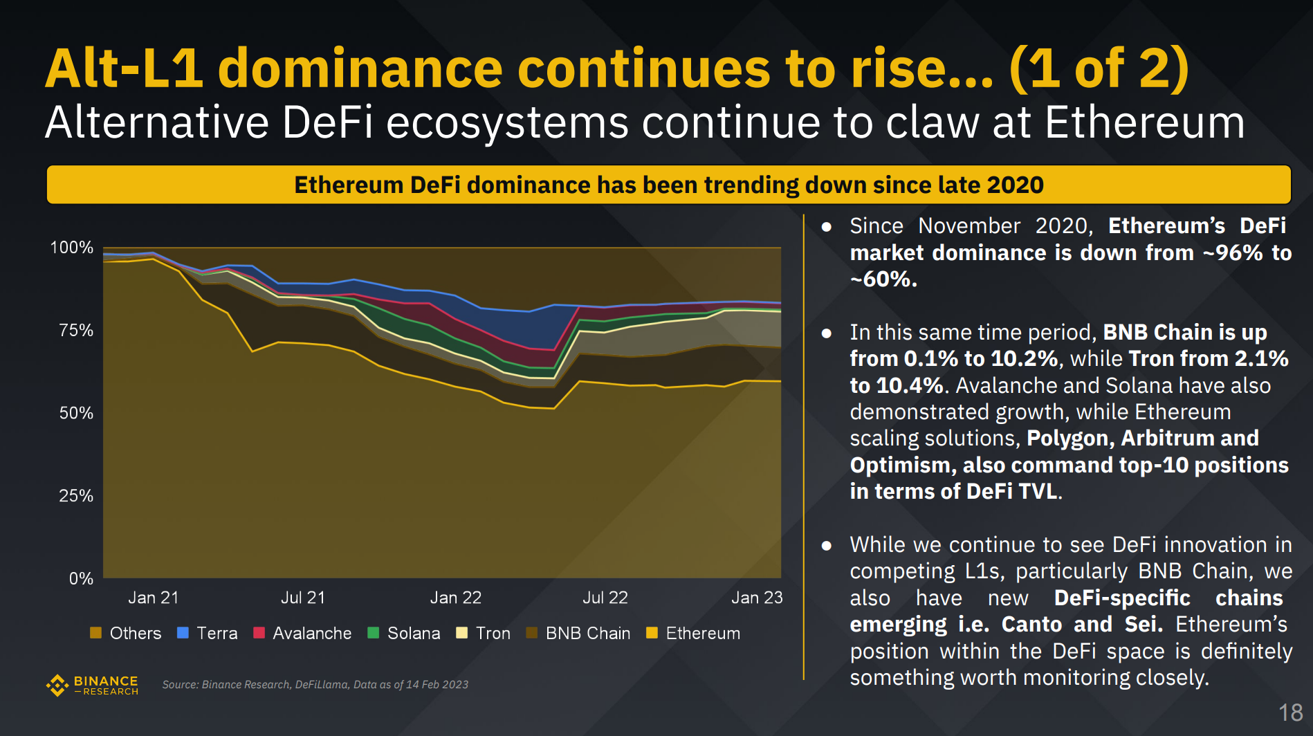 이더리움은 우수한 생태계를 갖고 있는 레이어1 솔루션입니다. 그러나 그 자리를 BNB, 트론, 아비트럼, 폴리곤과 같은 경쟁자들이 위협하고 있습니다. 실제로 이더리움의 디파이 시장 점유율은 최고 96%에서 60%까지 하락해왔습니다.