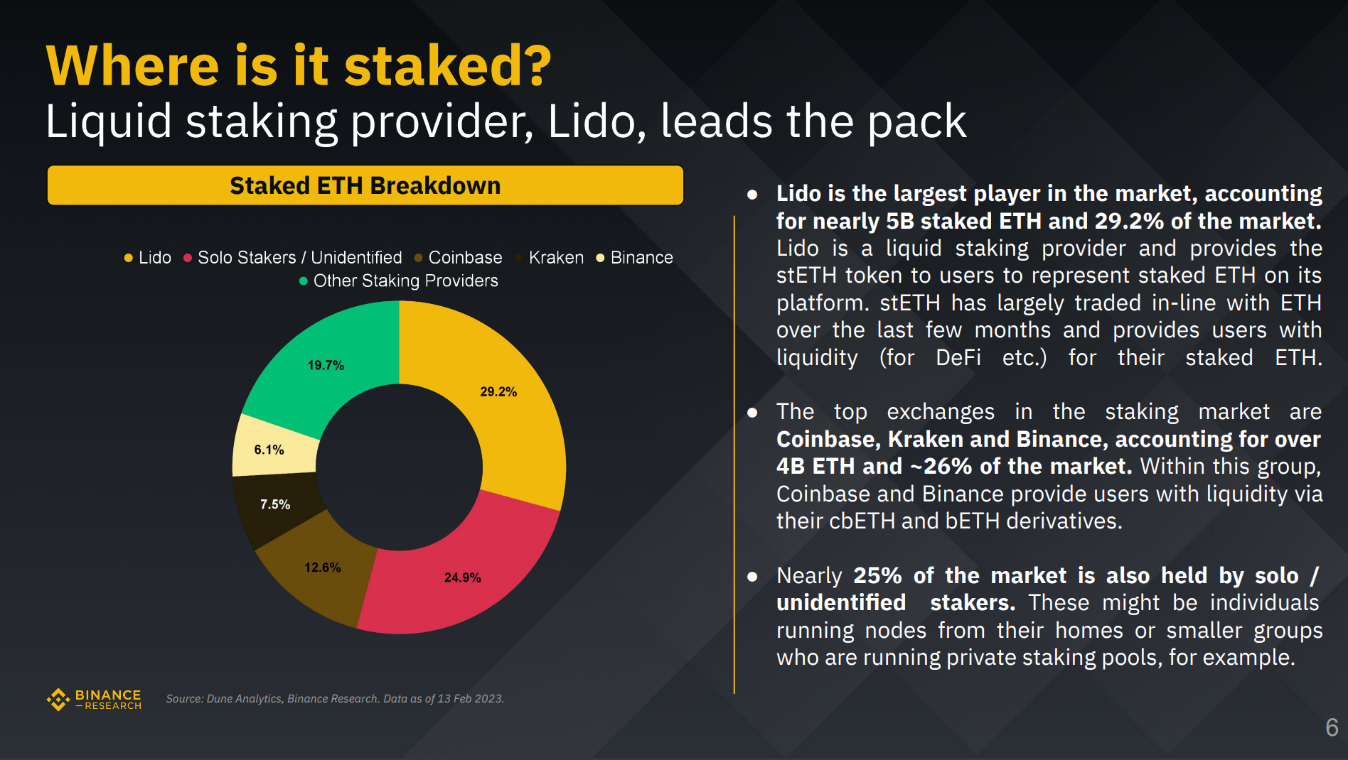 현재 전체 52만 이상의 검증자가 이더리움 스테이킹에 참여 중인데요. 약 1,650만 ETH가 스테이킹되어 있습니다. ETH 스테이킹 물량은 리도(Lido) 및 단독 스테이킹에 가장 많이 묶여있습니다.