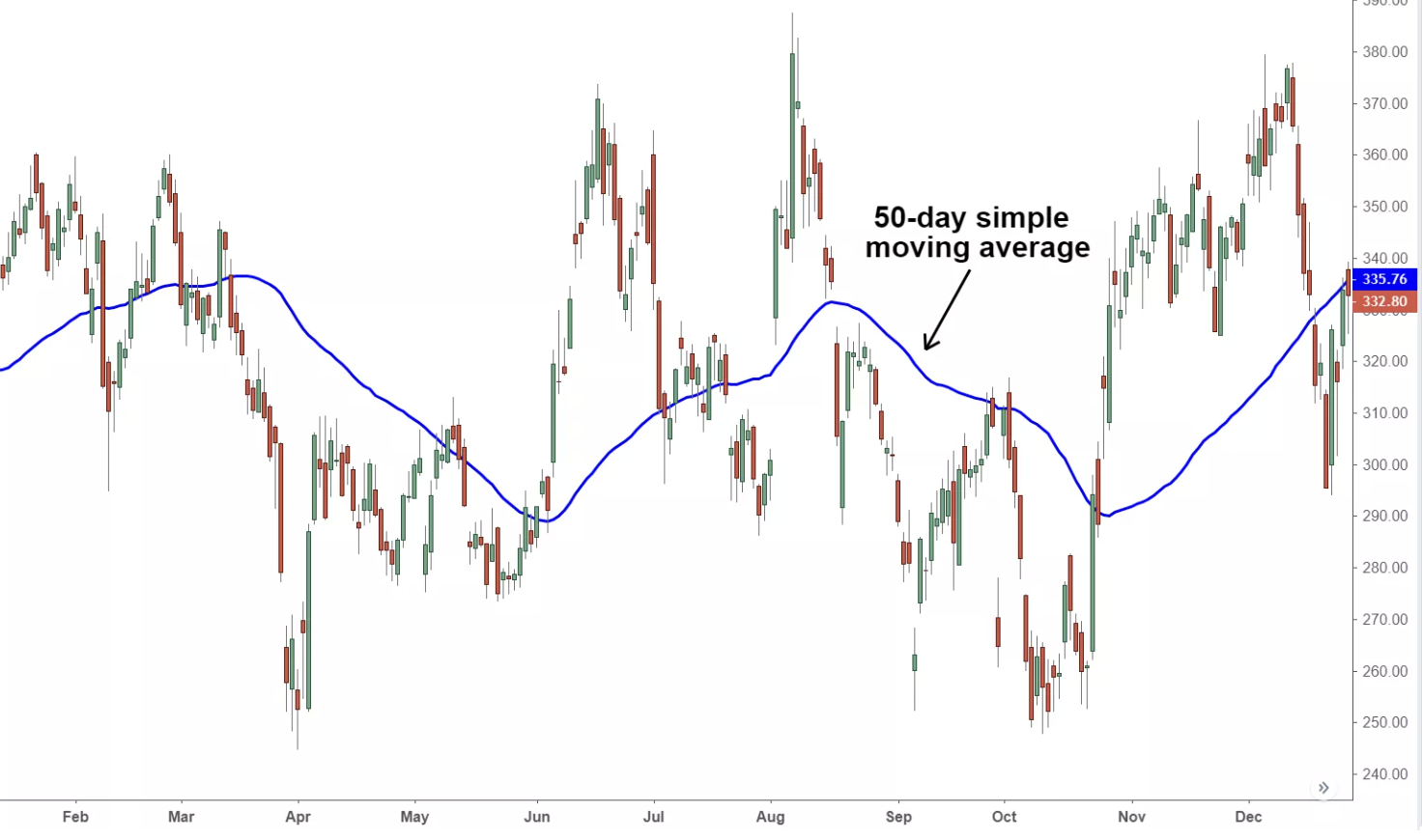 단순이동평균은 지난 기간 동안의 데이터를 통해 해당 자산의 평균 가격을 계산합니다. 예를 들어, 지난 50일간의 데이터를 기준으로 평균을 계산하도록 설정한 경우 최근 50일을 기준으로 이동평균 수치가 업데이트됩니다.