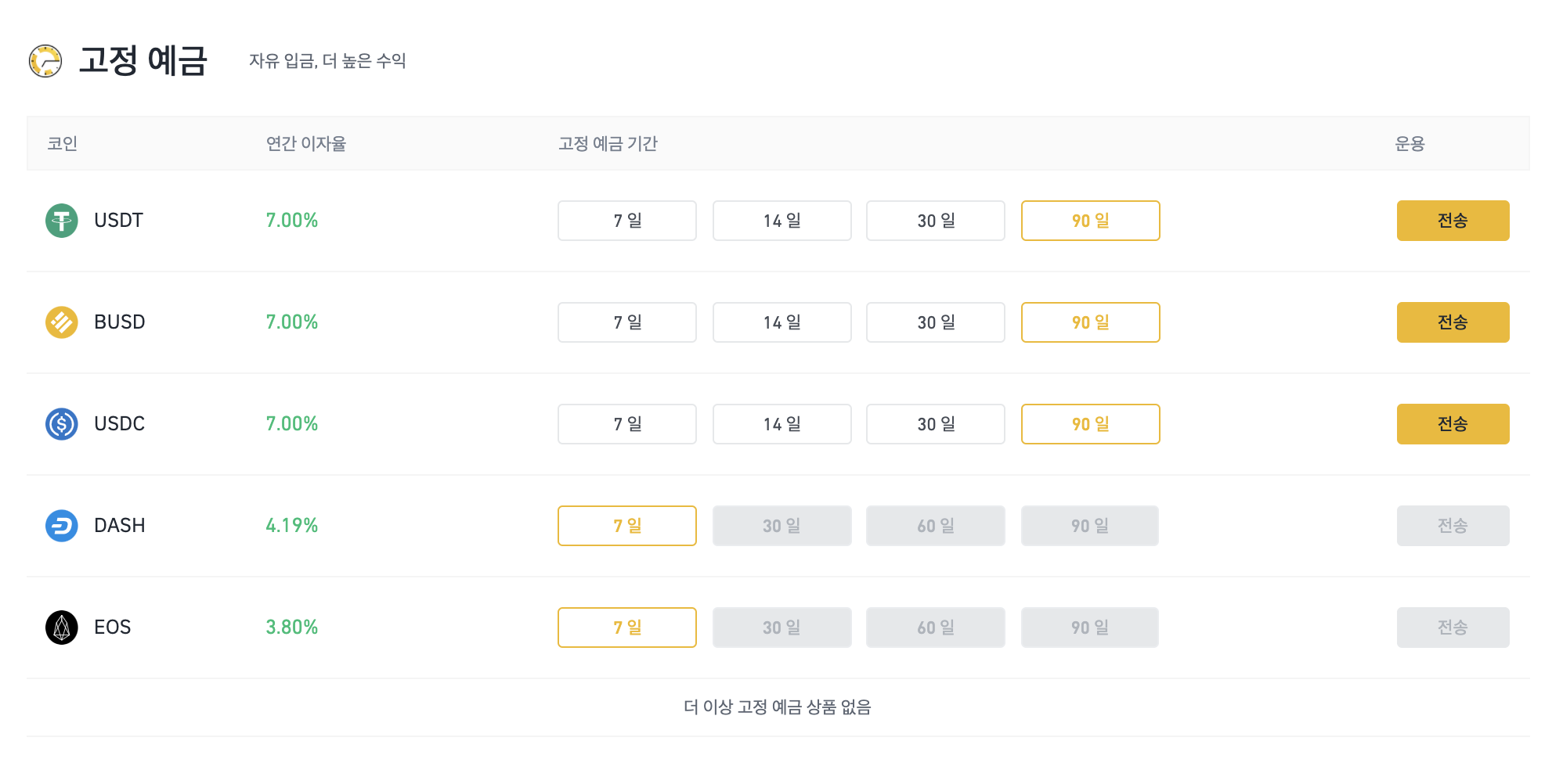 암호화폐를 거래하시는 분들은 잘 알고 계실 세계 최대 거래소인 바이낸스에서는 현재 연 이율 7%의 고정 예금 서비스를 제공하고 있습니다. 고정 예금 서비스란 특정 기간 동안 예금에 가입하고 만기시 이자를 지급 받는 예금 서비스를 의미합니다.