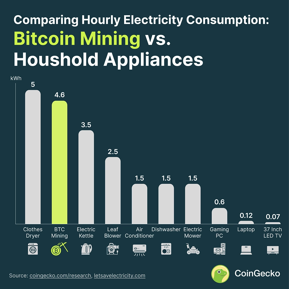 1 BTC를 채굴하는 데 1시간 동안 사용되는 전력량은 주택용 가전제품과 비교했을 때 그렇게 크지 않습니다. 아래 표는 비트코인 채굴과 주택 가전제품의 시간당 전력 소비를 비교한 것입니다.