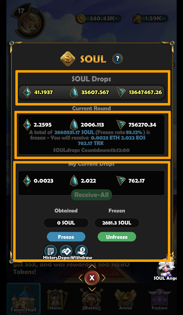 체인즈 아레나에는 이더리움, 이오스, 트론 총 3개의 배당 풀이 존재합니다. 가장 위에 표시된 SOUL DROPS은 풀의 전체 배당금입니다. 배당은 24시간에 한 번씩 분배 되며, 배당을 지급 받기 위해서는 소울 코인을 스테이킹 해야 합니다. 배당금은 전체 소울 코인 스테이킹 대비 자신의 스테이킹 비율에 따라 결정됩니다. 주의할 점은 배당금을 지급 받기 위해서는 배당이 지급된 후 24시간 내에 게임에 접속해 이를 수령해야 한다는 것입니다.