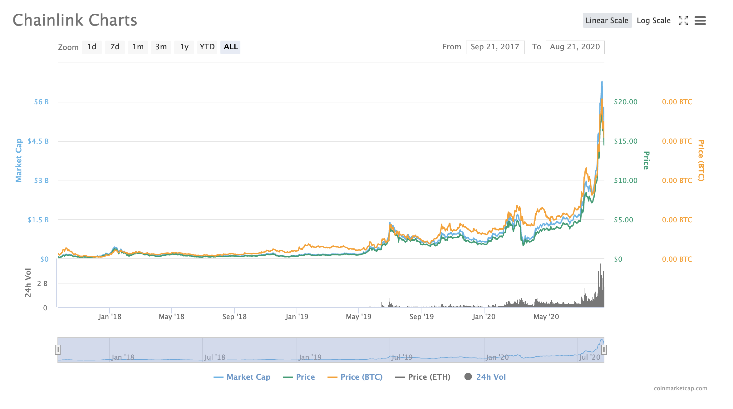 체인 링크 가격이 상승하는 데는 여러 이유가 있겠지만 무엇보다도 현재 암호화폐 세계에서 또 다른 열풍을 불러일으키고 있는 디파이(탈중앙 금융)을 간과할 수 없습니다. 누군가는 이를 ICO와 같은 거품에 비유하기도 하지만, 디파이에 동결된 이더(ETH)는 6월 중순 10억 달러에서 8월 초 45억 달러로 증가했죠.