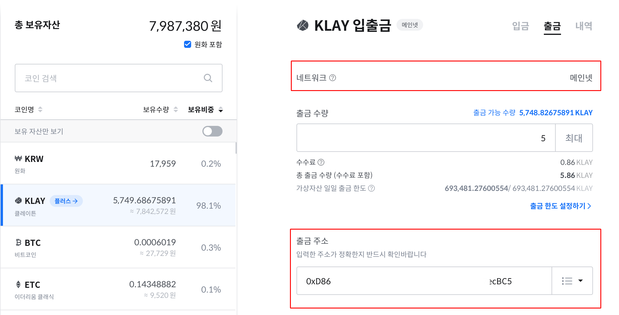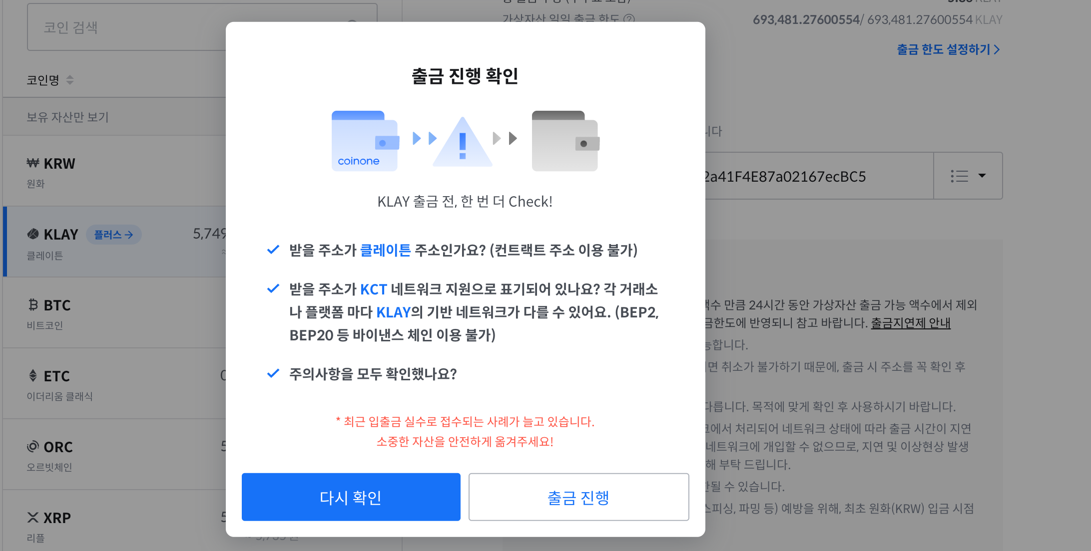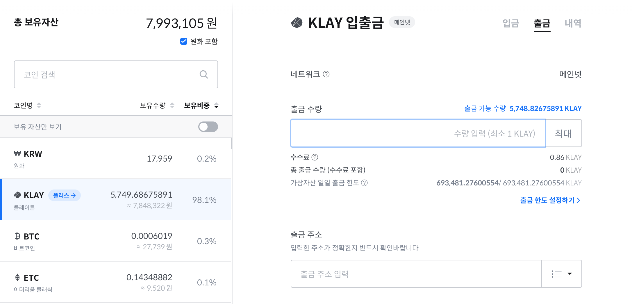 코인원 거래소에서 카이카스 지갑으로 클레이 전송하기
