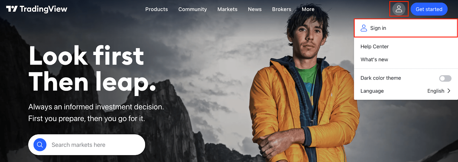 1. 트레이딩뷰 웹사이트에 접속하여 계정에 로그인하시거나 시작하기 [Get Started]를 클릭하여 계정을 만듭니다. 새롭게 회원가입하시는 경우 이 링크를 통해 가입하시면 $30 증정금 혜택을 받으실 수 있습니다.