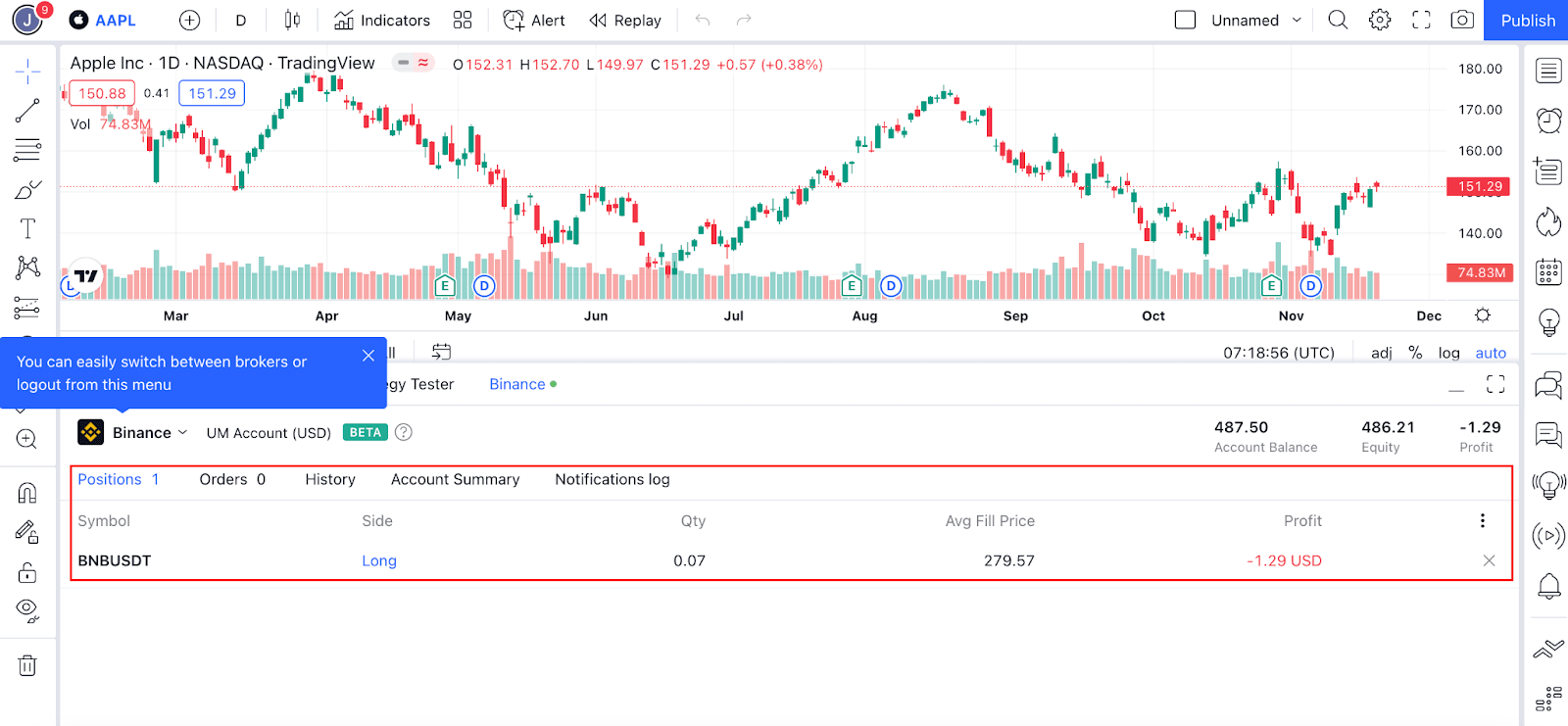 바이낸스 계정 연결이 완료되면 트레이딩뷰 인터페이스로 리디렉션됩니다. 현재는 USDⓈ 선물 계약만 사용할 수 있으며, 바이낸스에서 보유 중인 선물 포지션은 자동으로 트레이딩뷰 계정과 동기화됩니다.