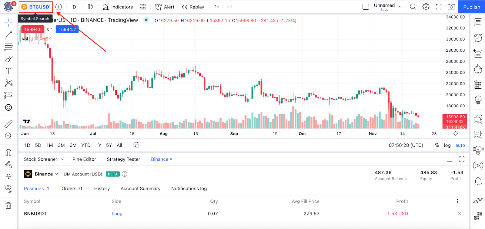 1. 트레이딩뷰 인터페이스로 이동하여 트레이딩 패널의 왼쪽 상단에서 거래하려는 심볼을 선택합니다(예: BTCUSDTPERP). 바이낸스 선물 USDⓈ에 상장된 모든 코인을 선택하여 거래할 수 있습니다.