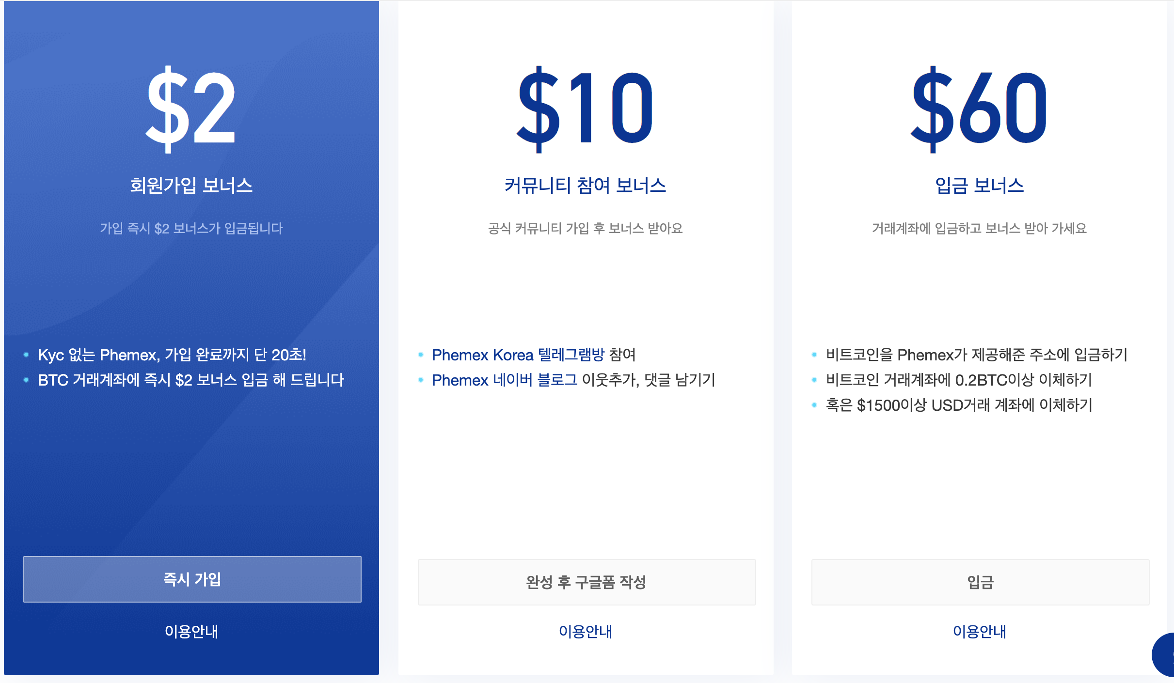 아래 링크로 페멕스에 가입하시면 최대 72$의 증정금을 받으실 수 있습니다. 페멕스에서는 회원가입 보너스로 2$, 커뮤니티 참여 보너스로 10$, 입금 보너스로 60$, 총 72$의 증정금을 받으실 수 있는데요. 유의하실 점은 증정금은 직접 출금할 수는 없고, 이를 통해 수익을 내서 출금을 하거나 기존 거래의 수수료 등으로 사용할 수 있다는 것입니다. 또한 현물 비트코인이나 USDT를 출금시 초기화되니, 주의해서 사용하는 것이 좋습니다.