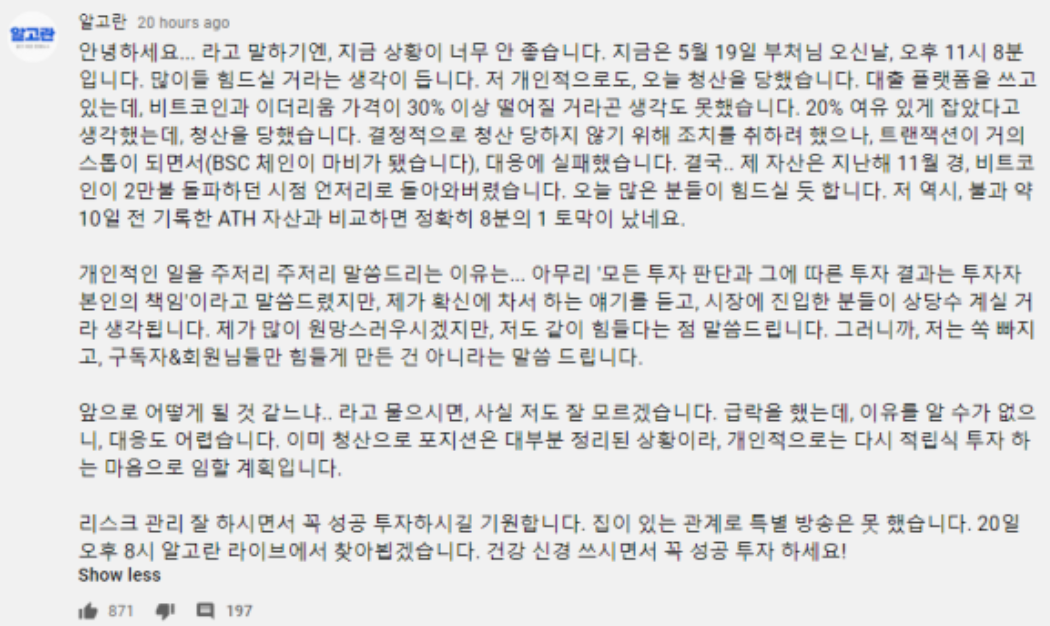 고란 기자님은 많이 힘드신지 방송 중에 우셨다고 하네요. 그것도 그럴 것이, 초기 시드가 5백, 6백 이었던 걸로 기억하는데 몇 년에 걸쳐 꾸준히 모으셨을 비트, 이더, BNB를 40억 상당까지 불리셨다가 크게 날리셨으니까요.